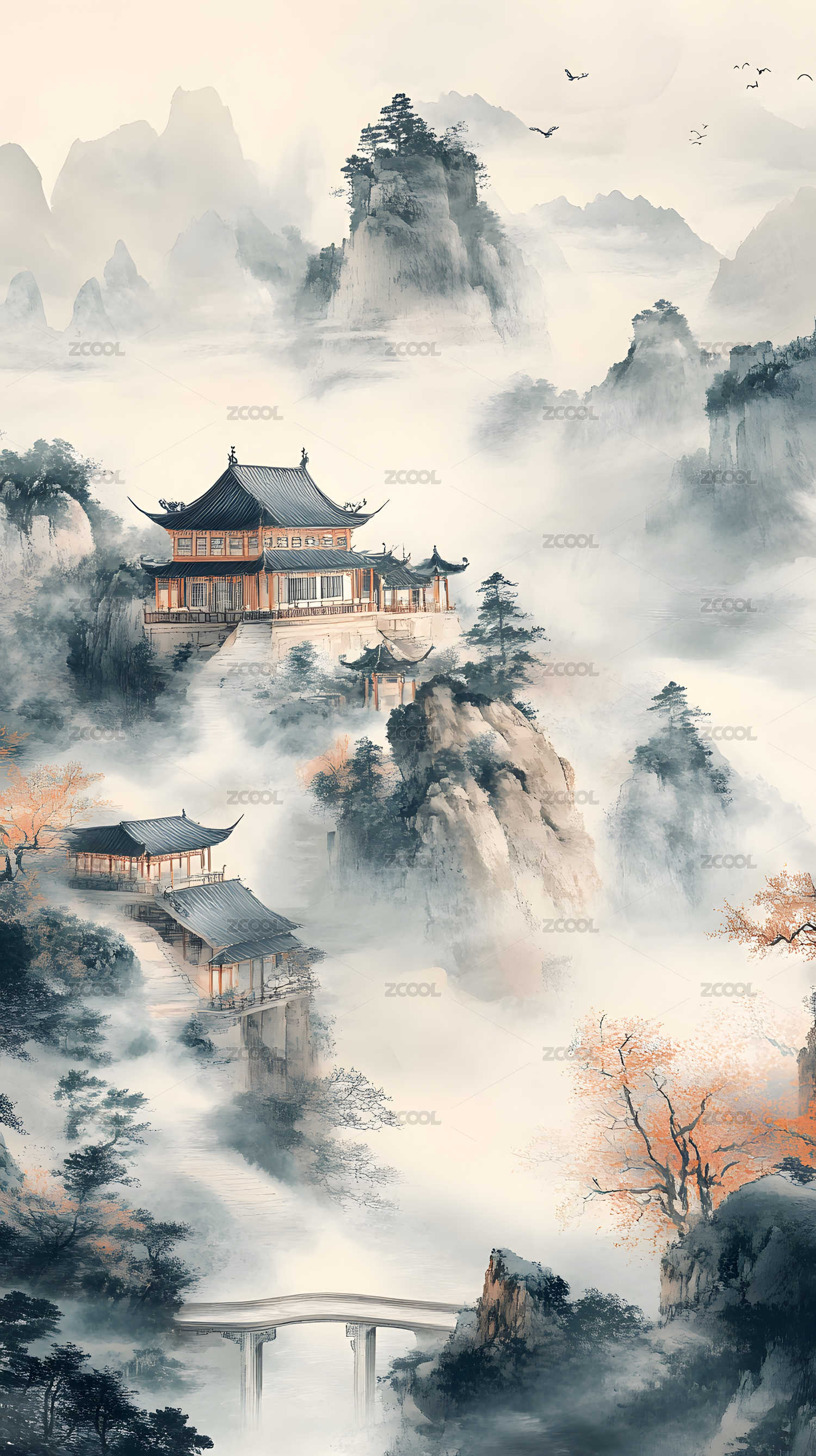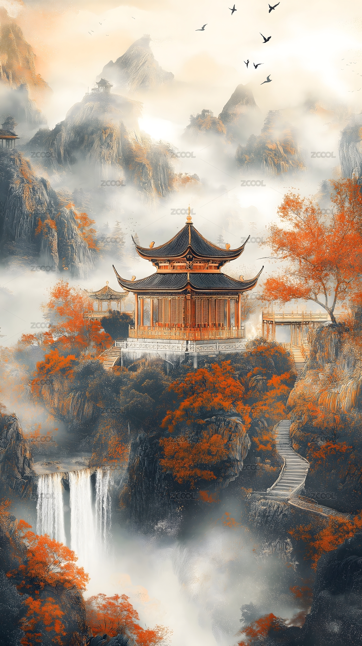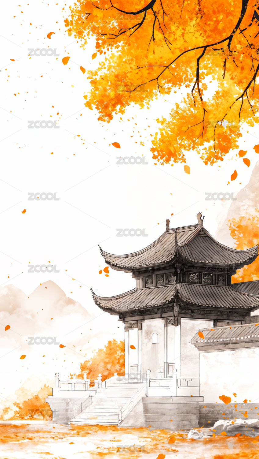 中国风山水建筑自然秋天落叶枫叶插画壁纸