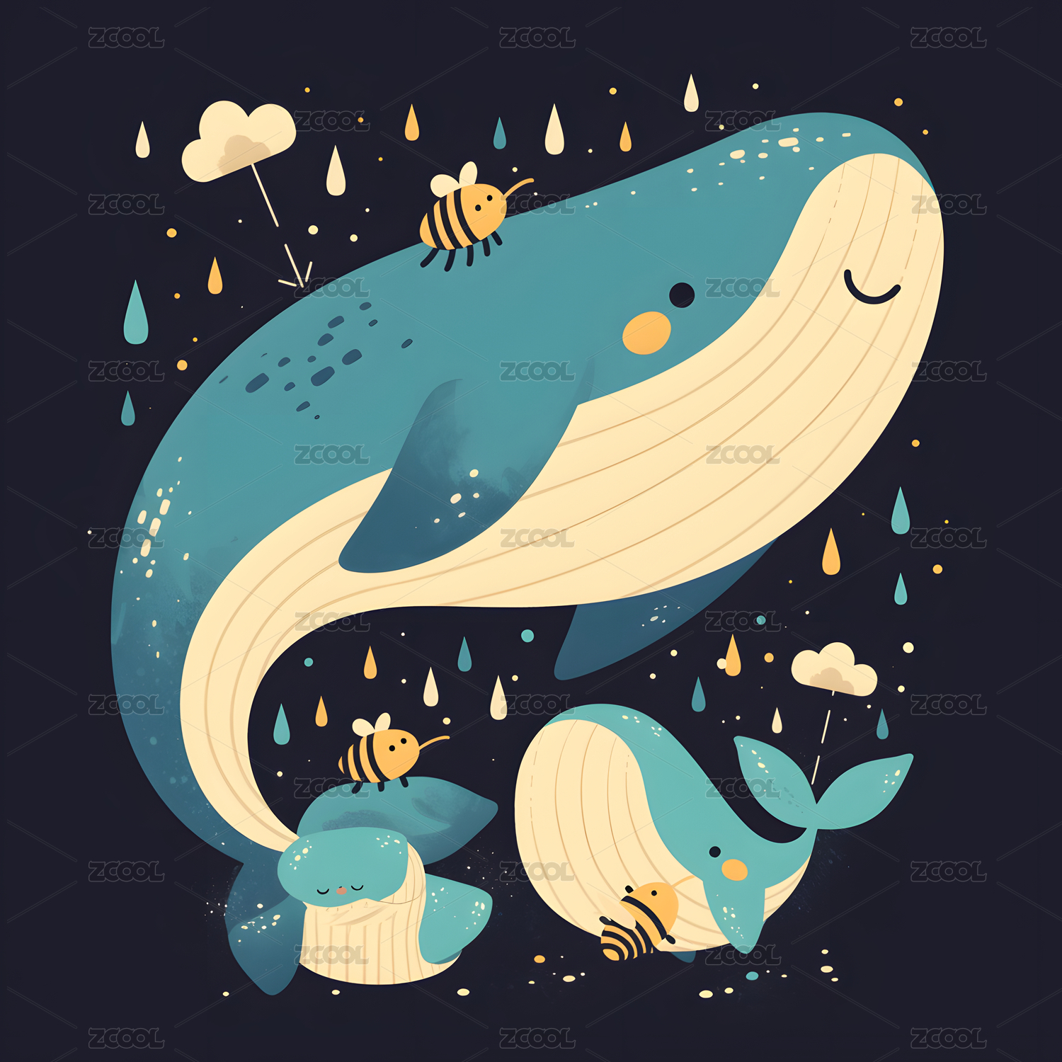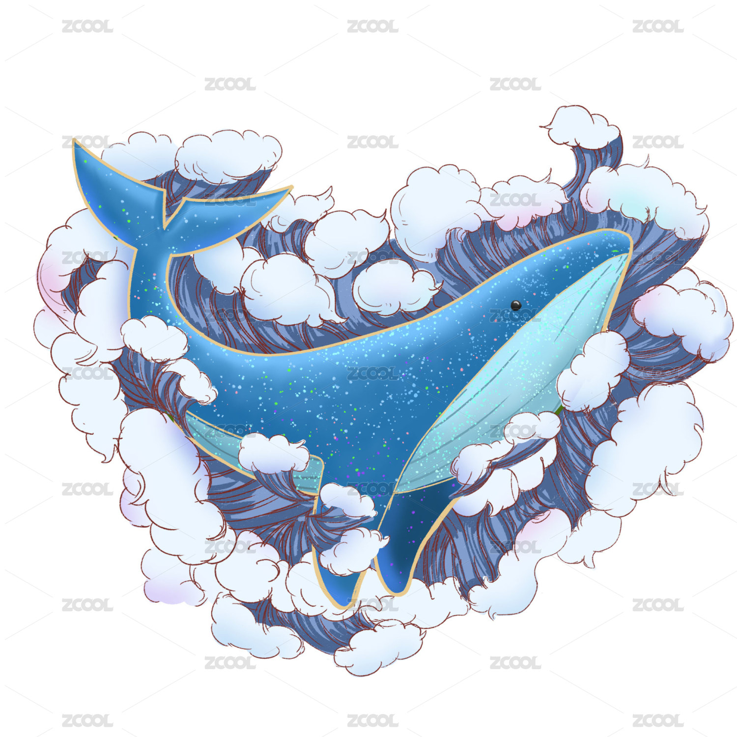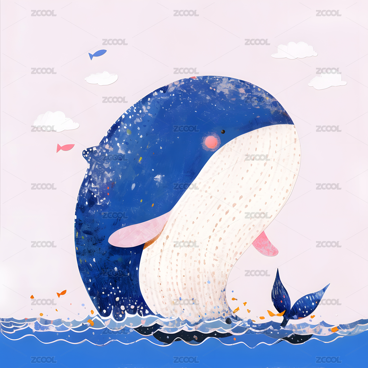 卡通童趣夏日在海水里游玩的小鲸鱼形象插画