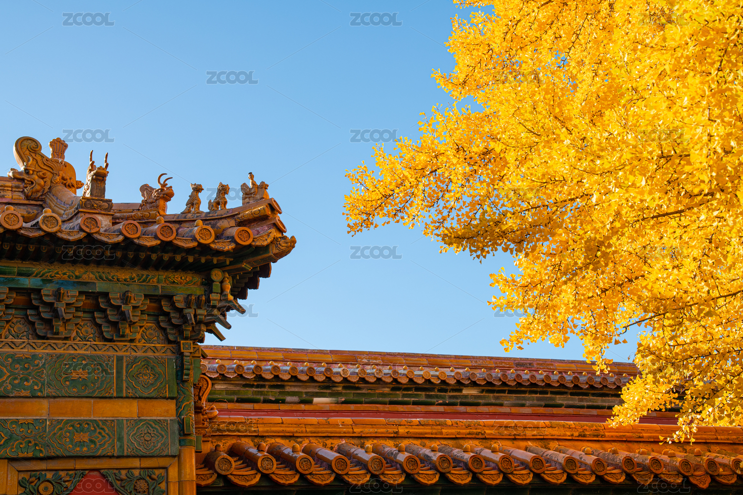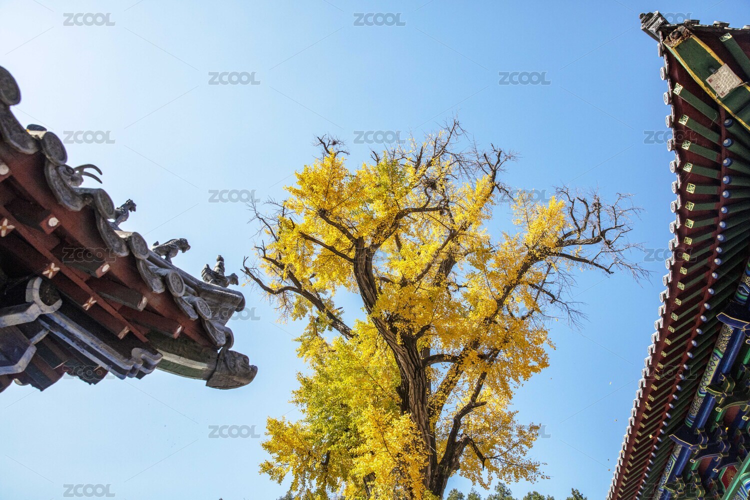 山东济南淌豆寺秋天黄色千年银杏树叶子金黄