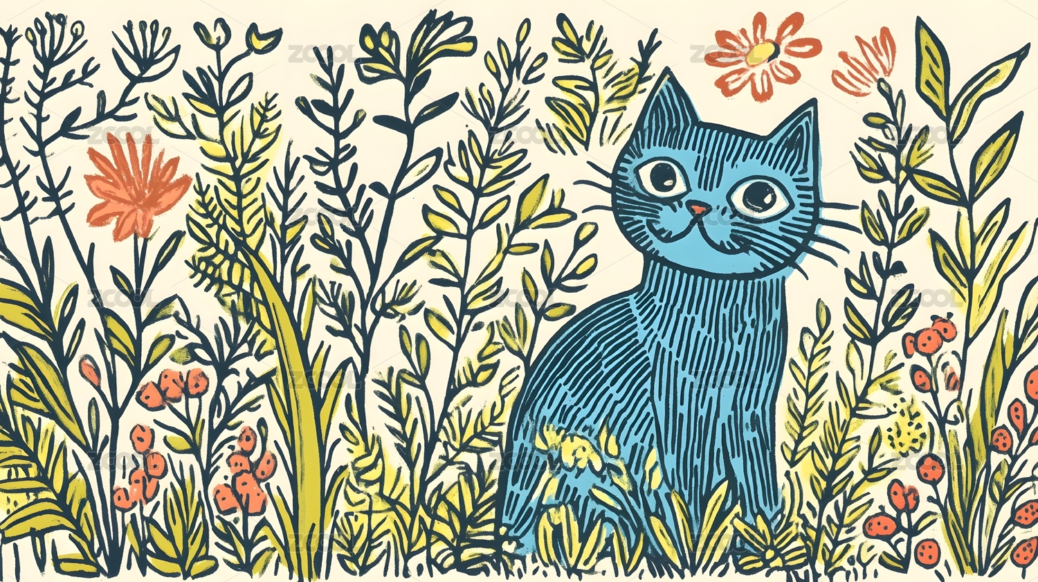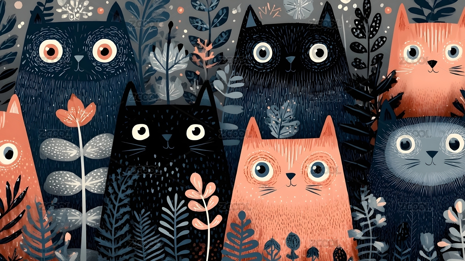 手绘彩色卡通猫猫质感笔触抽象装饰画背景