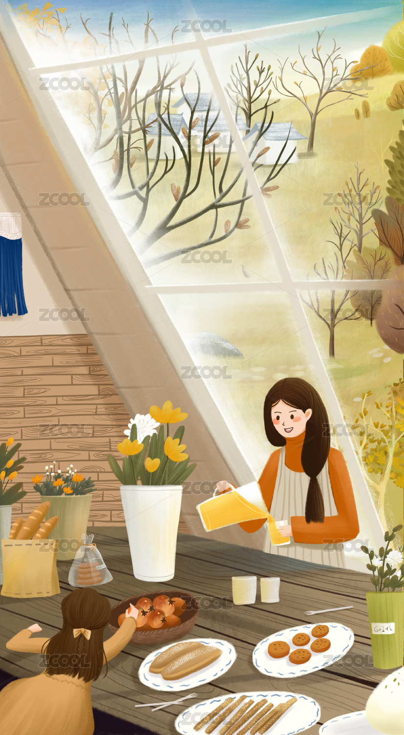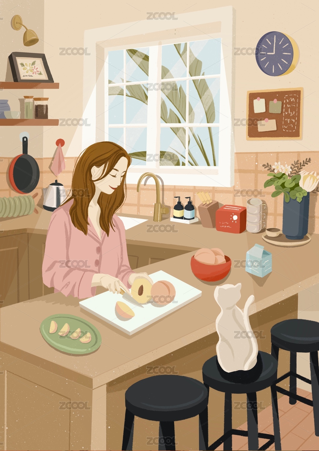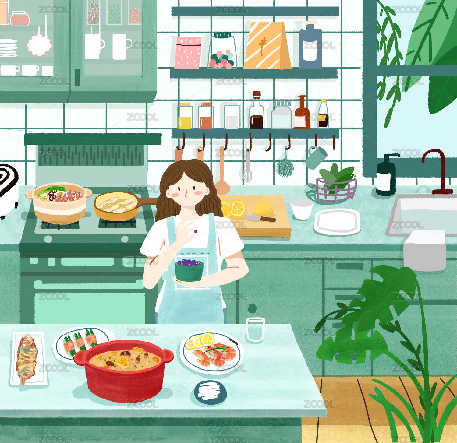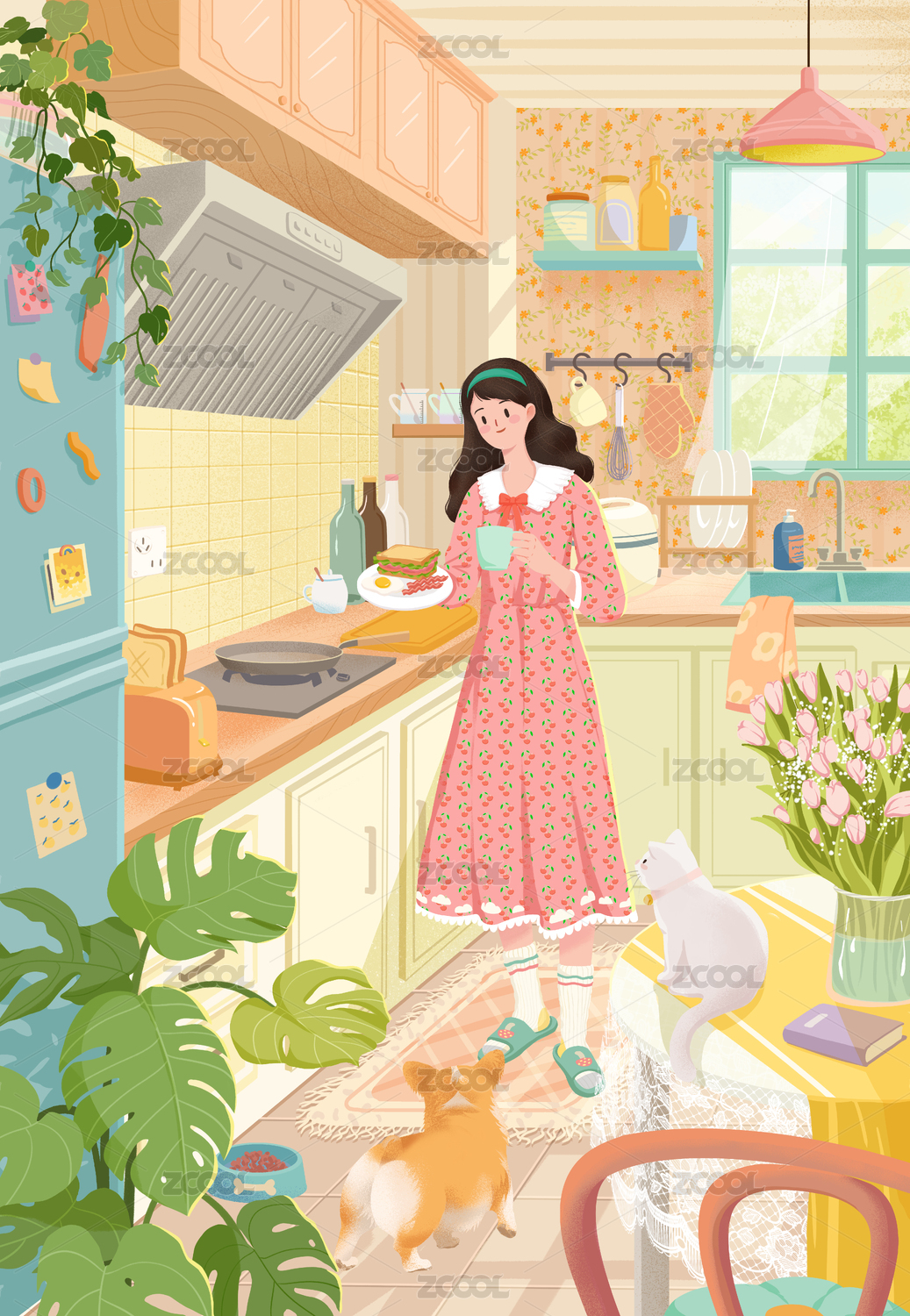 插画,美食,女孩,扁平,美好,居家,生活,日常