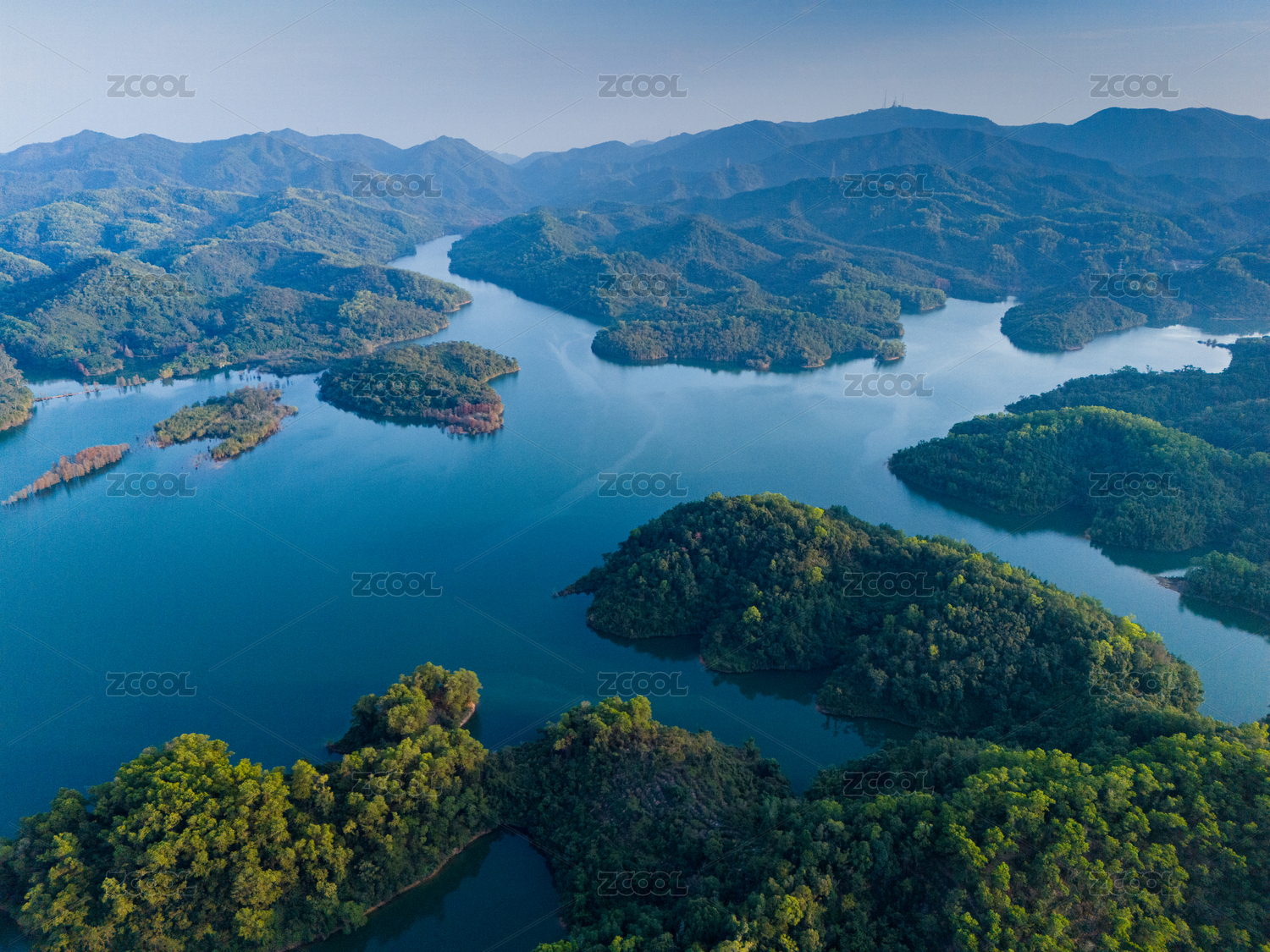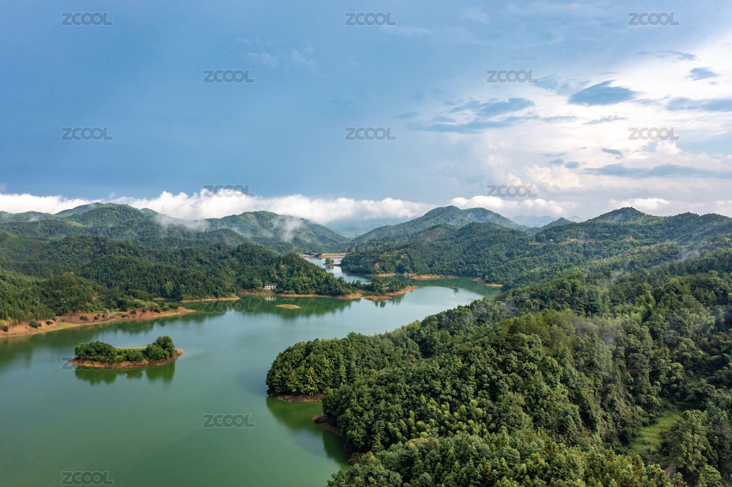 江西靖安观海驿站大型水库中的桥梁和公路俯