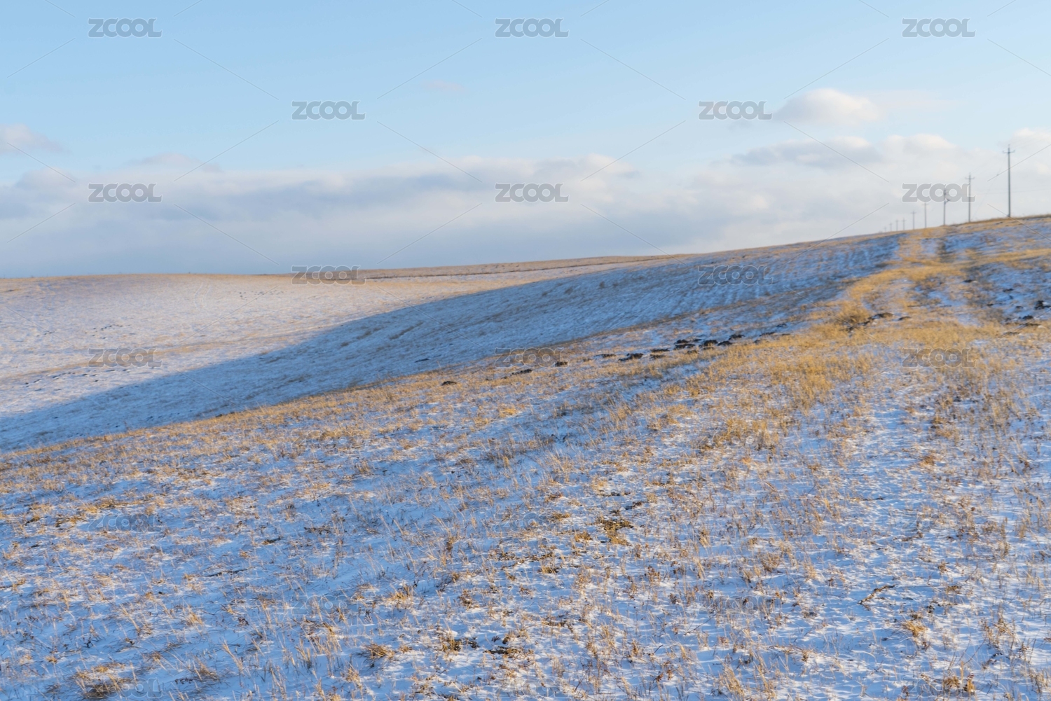 中国内蒙古呼伦贝尔公路旁积雪的草原