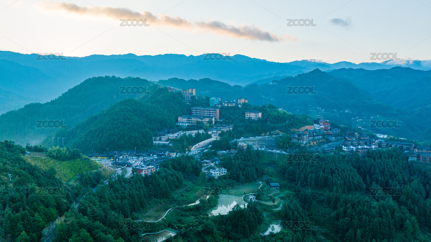 俯视贵州黔东南西江千户苗寨清晨风光