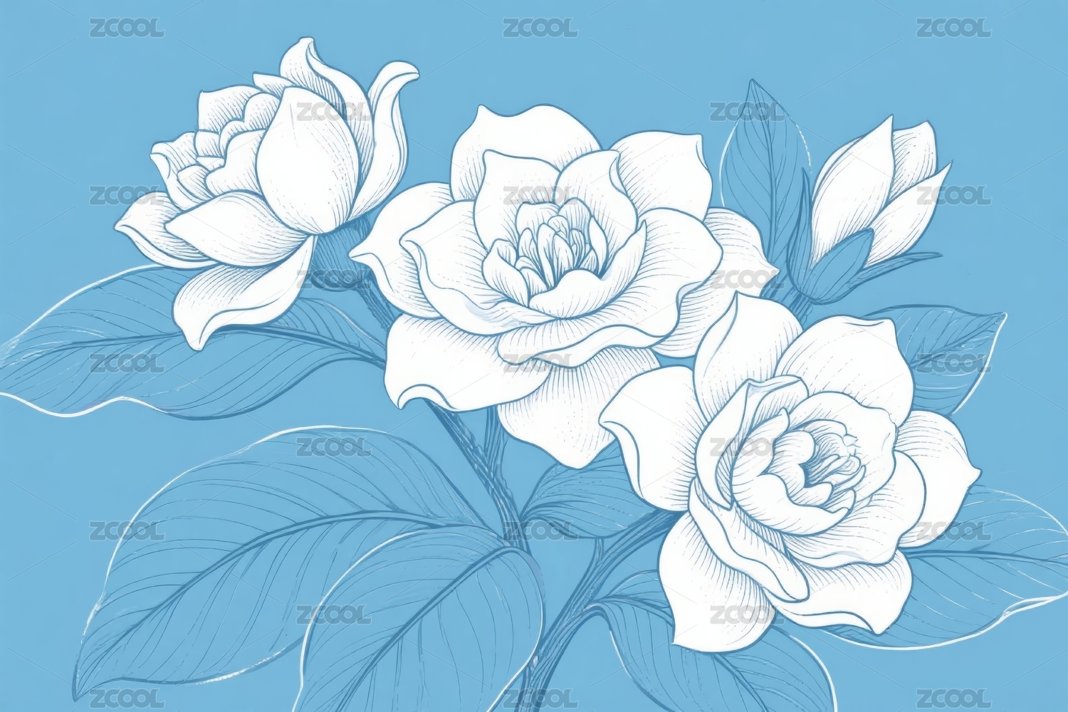 AIGCFG01,浮世绘,植物,白色,牡丹,大花,绿叶,勾线,花朵,花