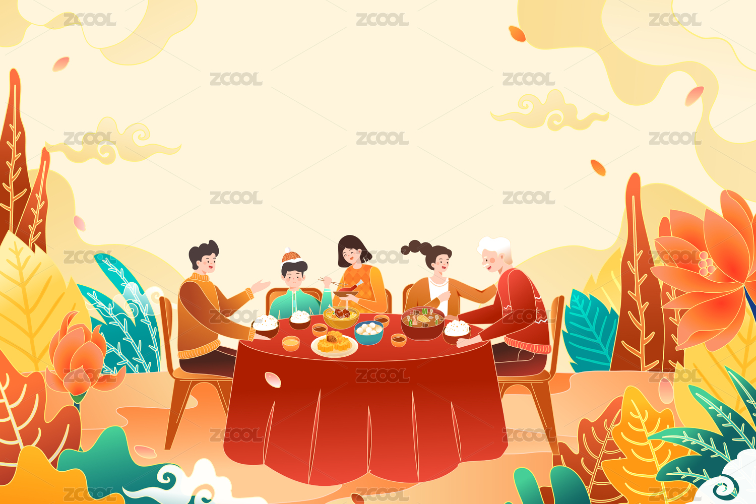 卡通新年春节年夜饭团圆饭吃饭家人团圆背景矢量插画