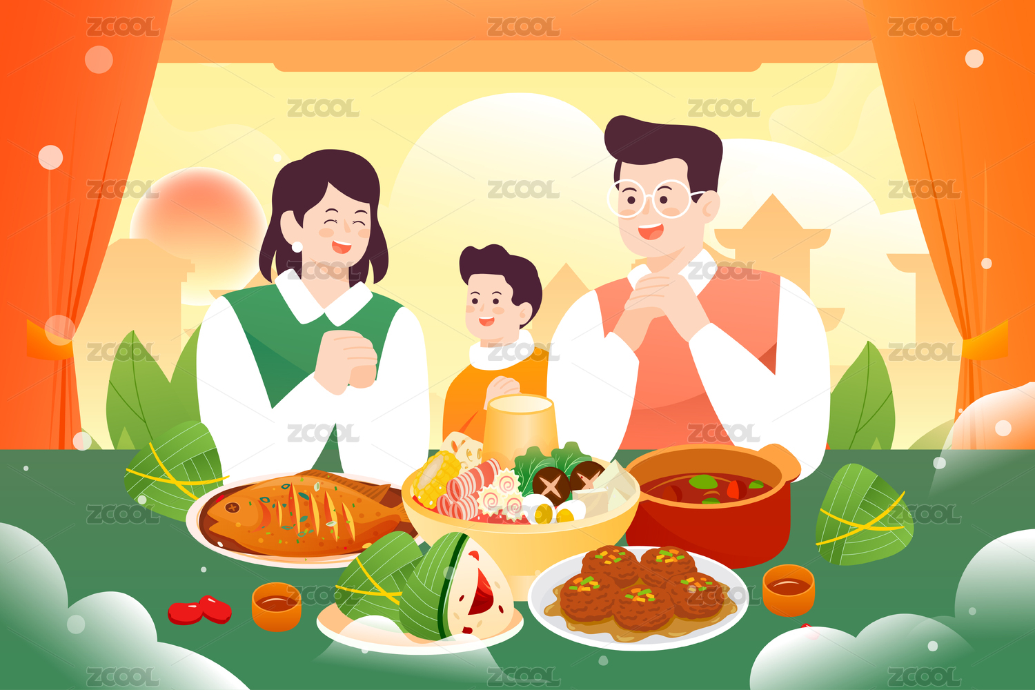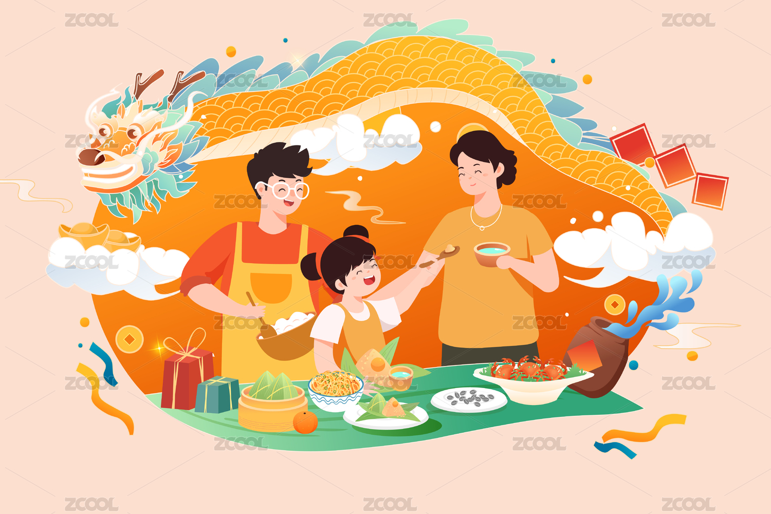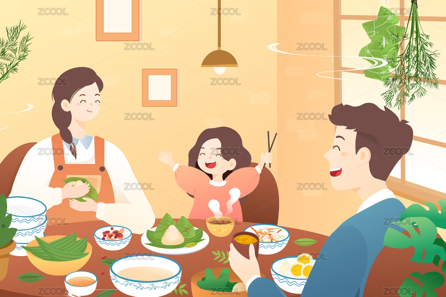 端午节合家团聚吃粽子家庭聚餐国潮插画