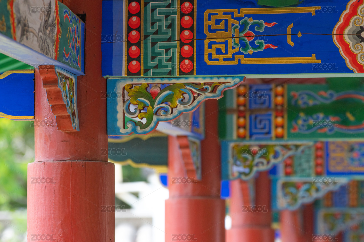中国北京南锣鼓巷胡同里房屋屋檐的彩绘