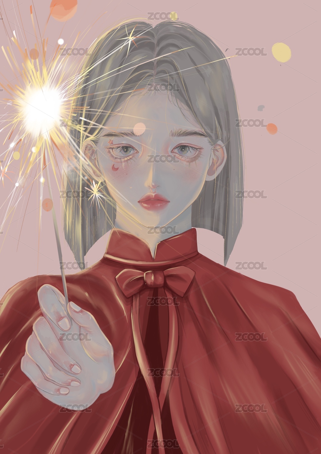 灯光,女孩,长发,卷发,忧郁,夜晚,插画