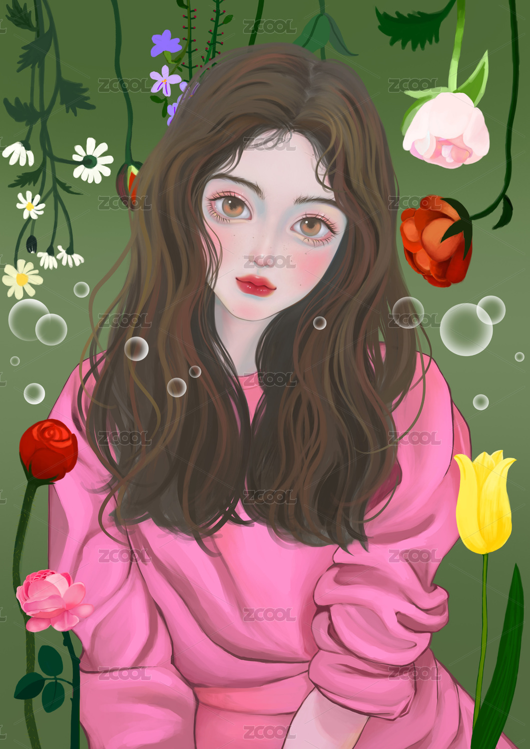 郁金香花朵蝴蝶结麻花辫温柔少女插画