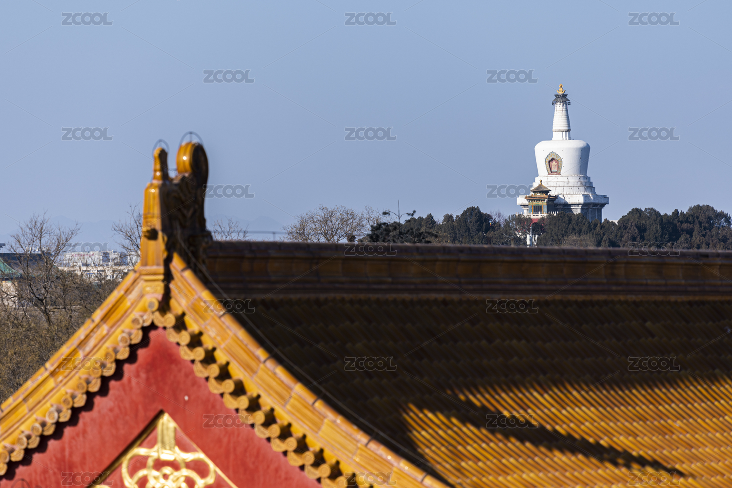 中国北京故宫博物院红墙内眺望北海公园白塔