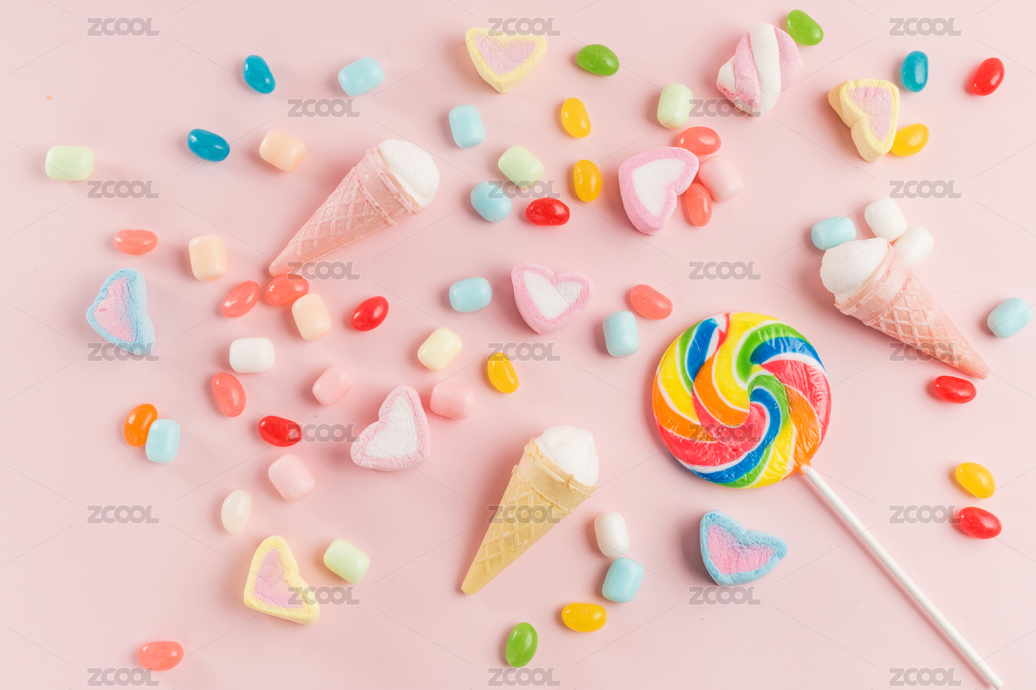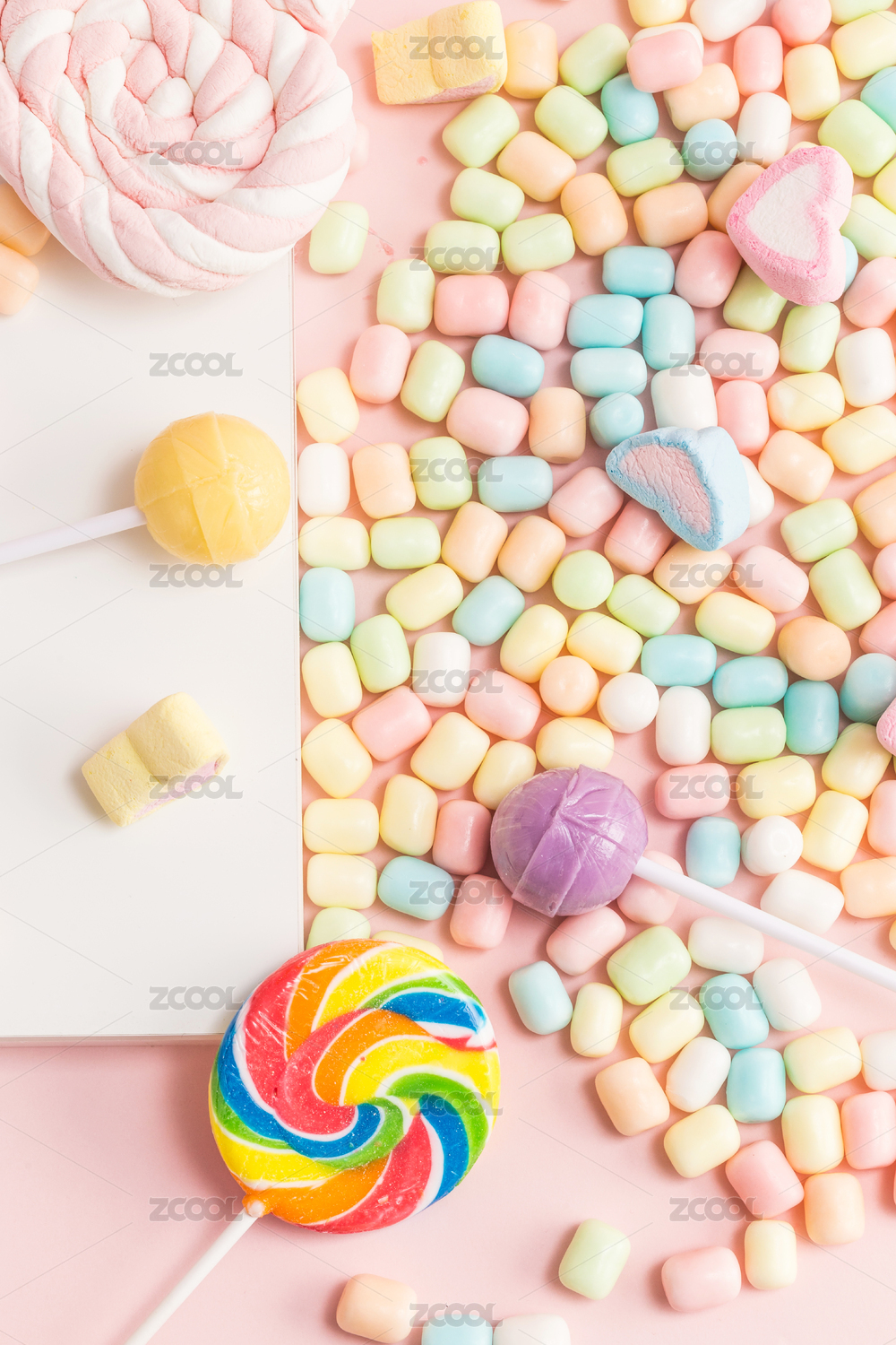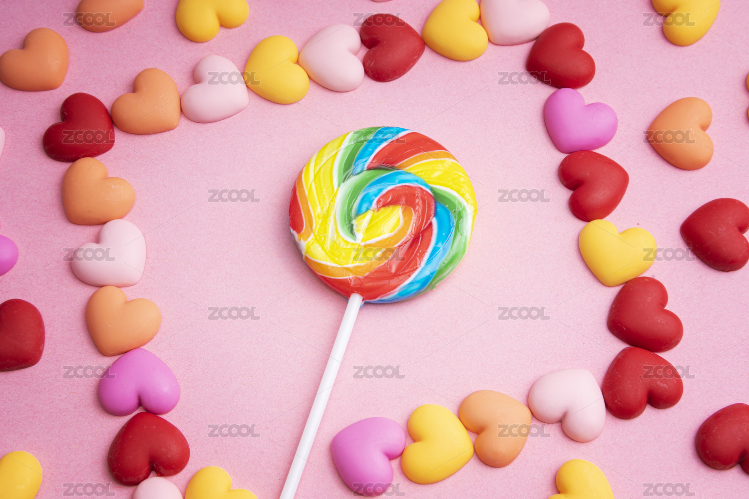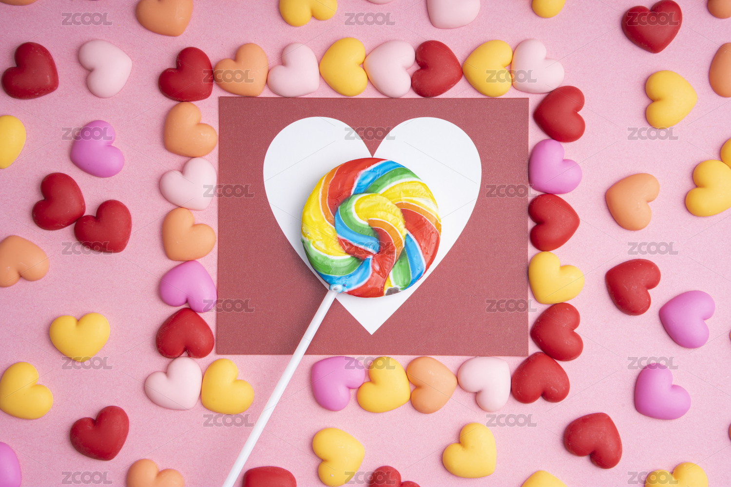 爱心糖果上放至的情人节贺卡与棒棒糖