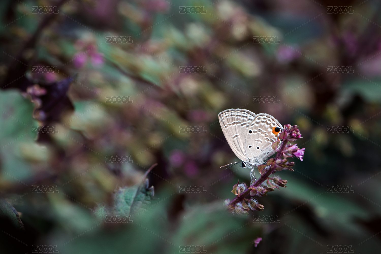 一只栖息中紫苏上曲纹紫灰蝶