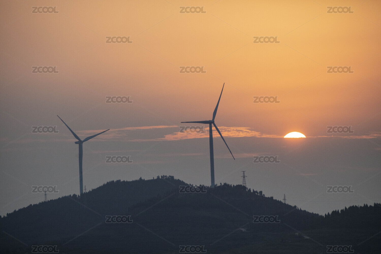 中国新疆阿勒泰地区夕阳下的风能发电机剪影
