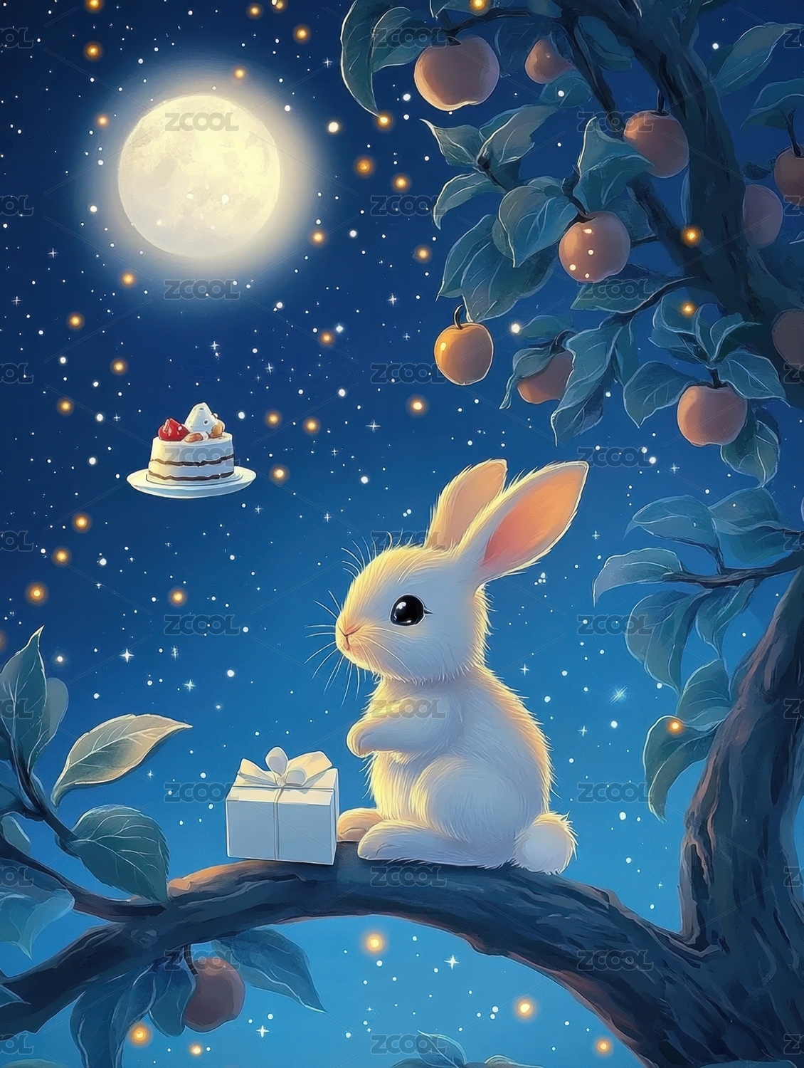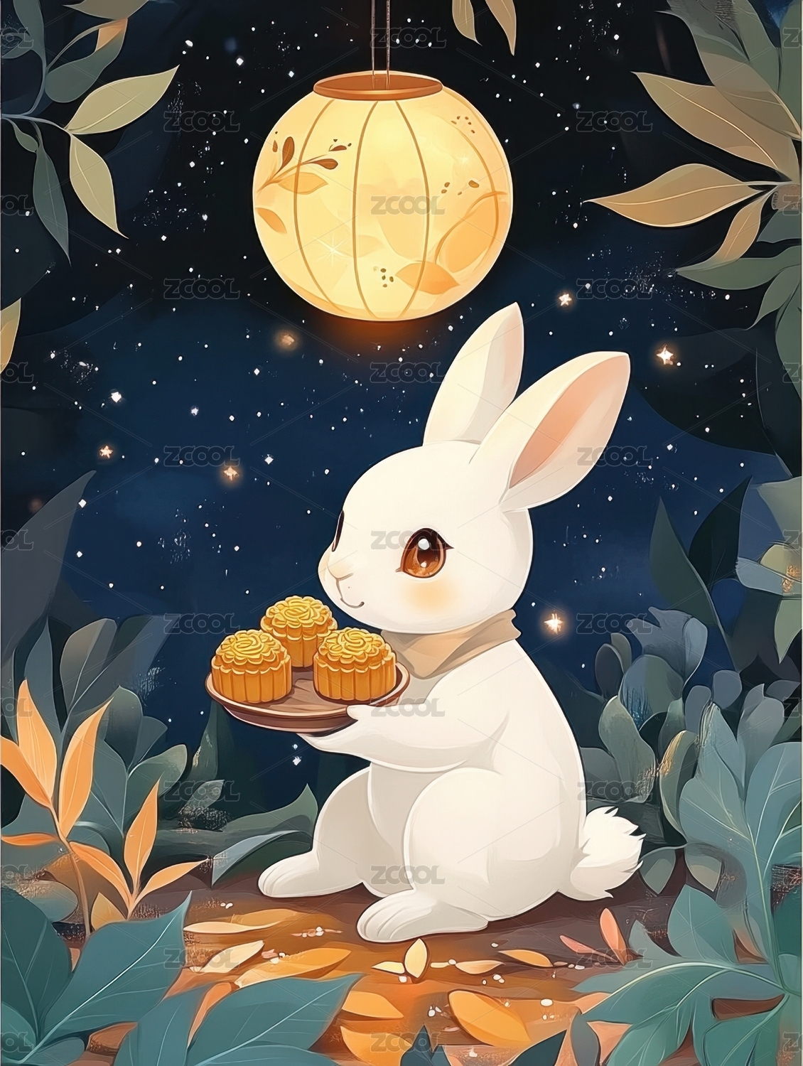 中秋节月亮玉兔抱着月饼赏月场景概念插图