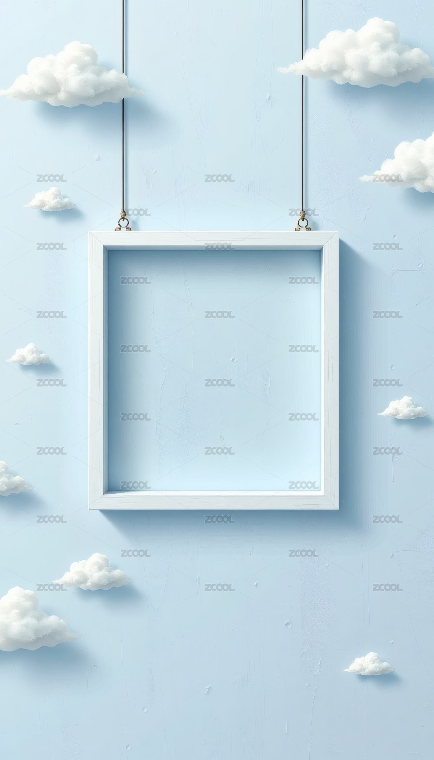 浅蓝色墙挂白框旁有云朵