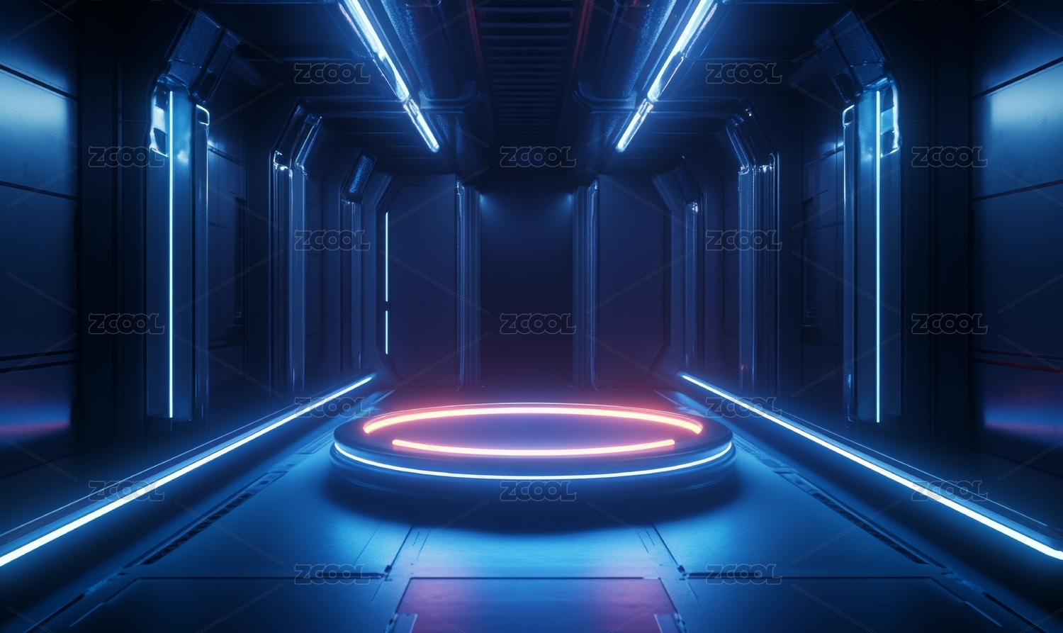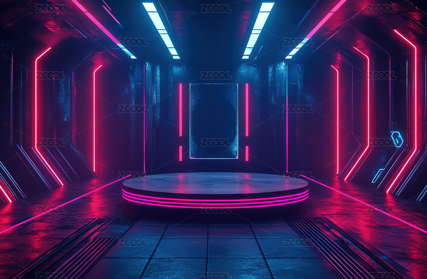 抽象霓虹灯矩阵科技感舞台赛博朋克3D插图
