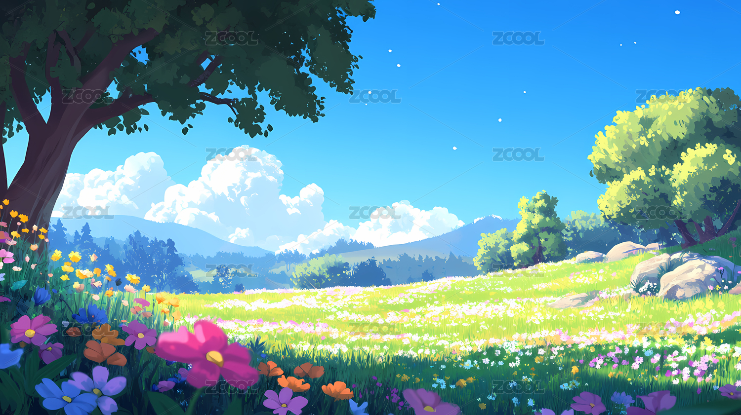 绿色卡通鲜花动漫背景插画