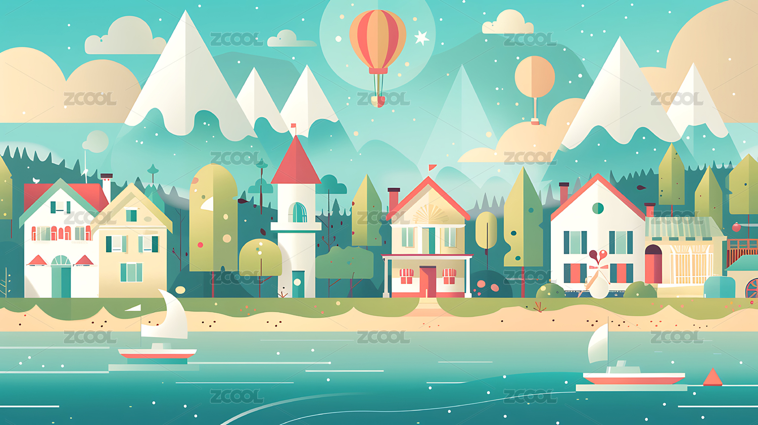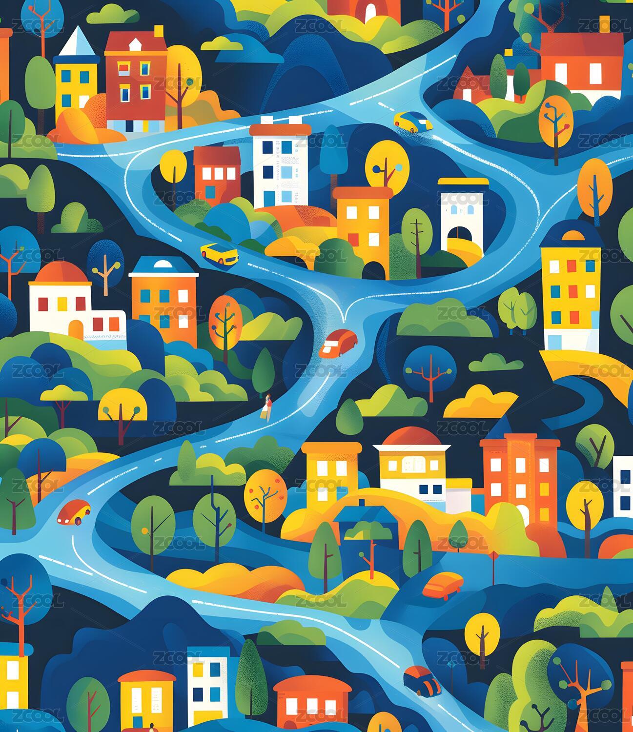 彩色小镇河畔生活插画