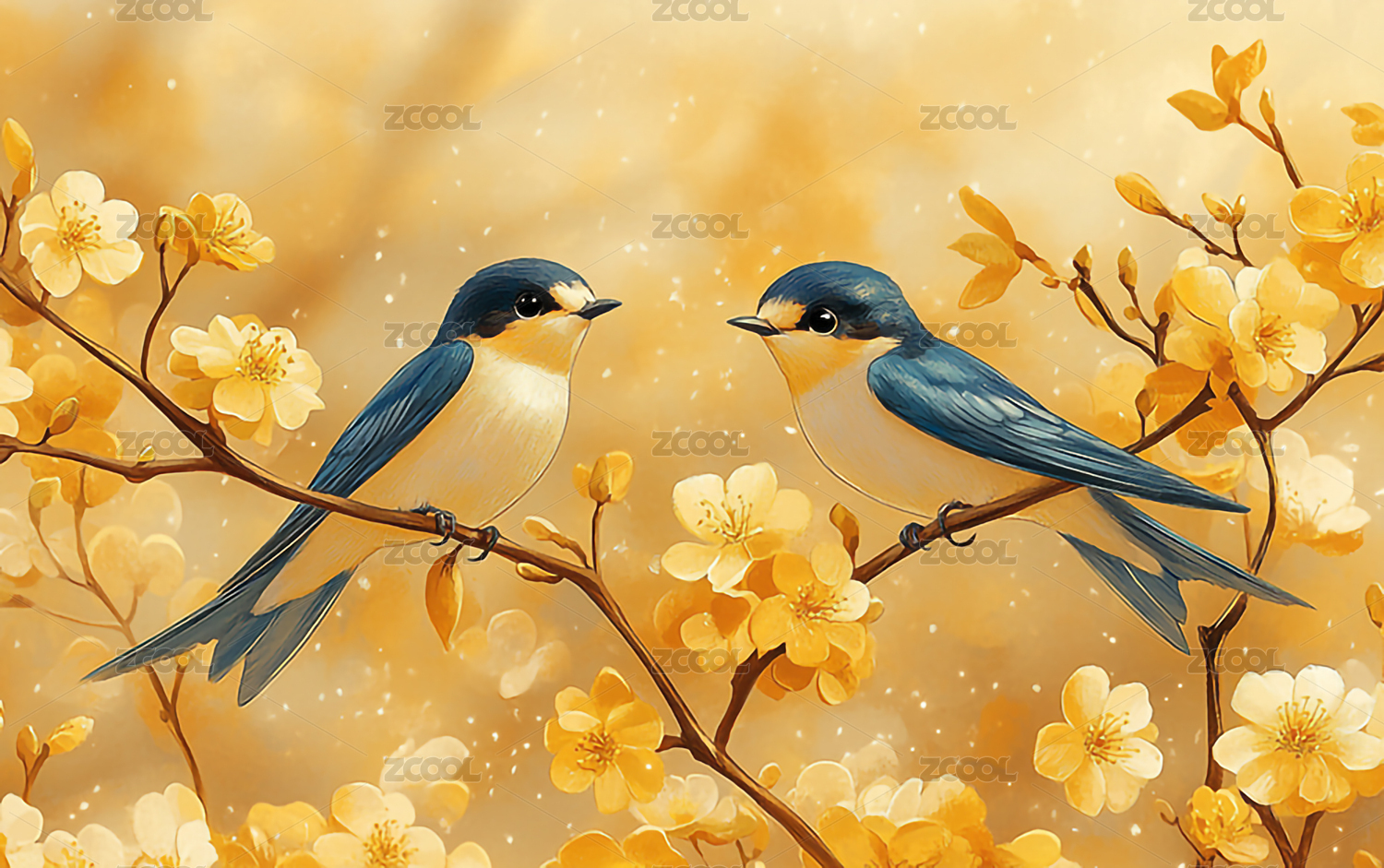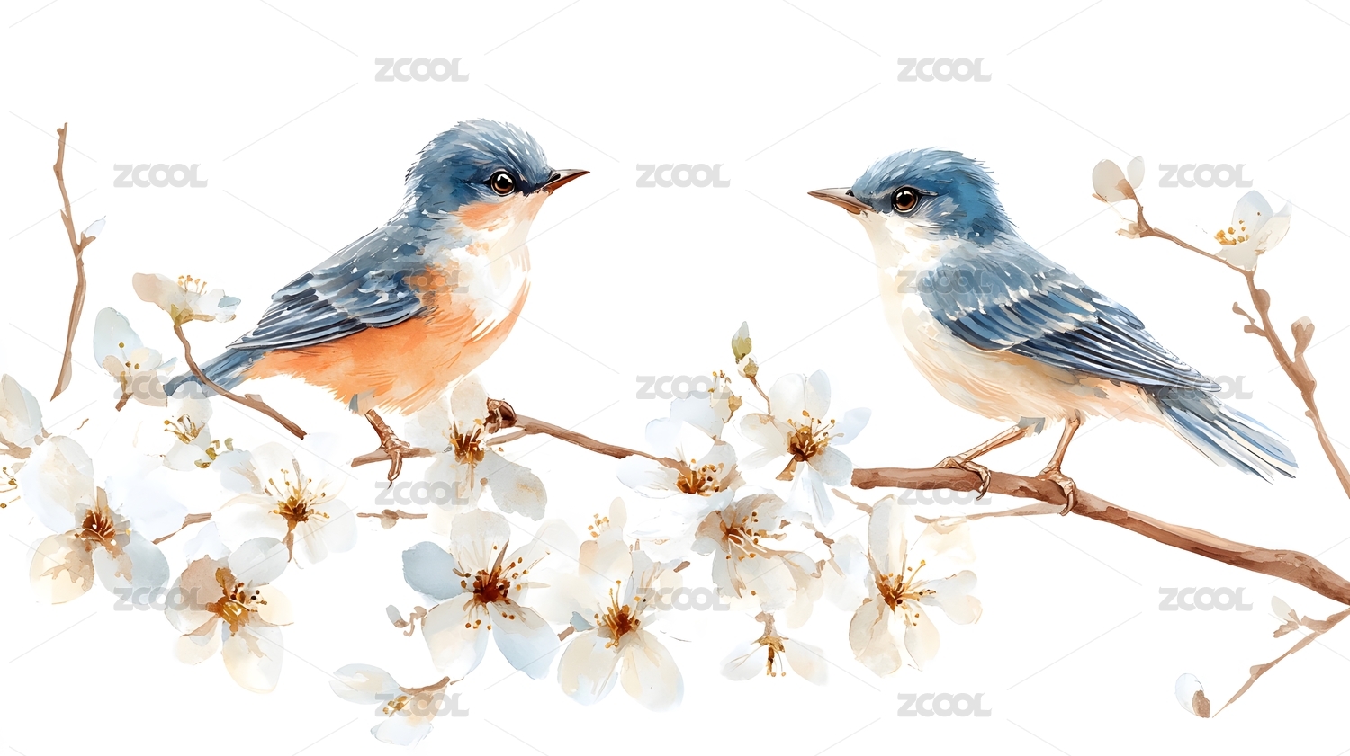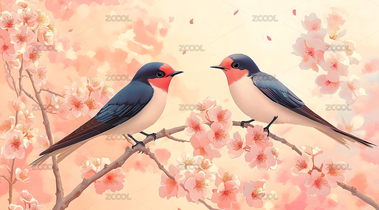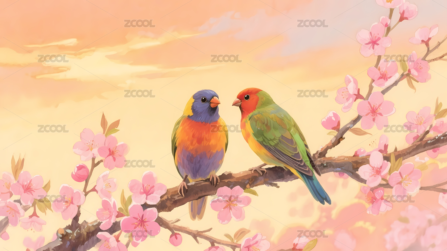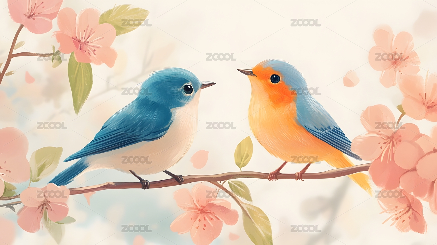 可爱小鸟相依偎于盛开的樱花枝头,温馨浪漫