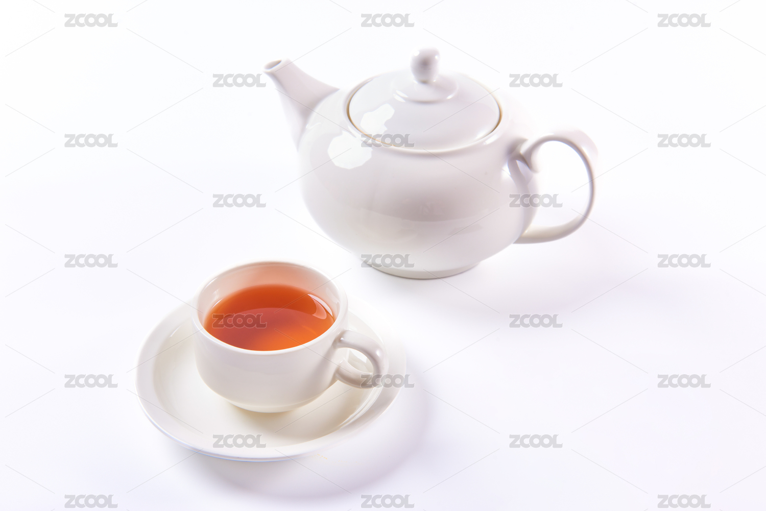 黑色背景上的茶壶和茶杯,茶杯里装满了茶水
