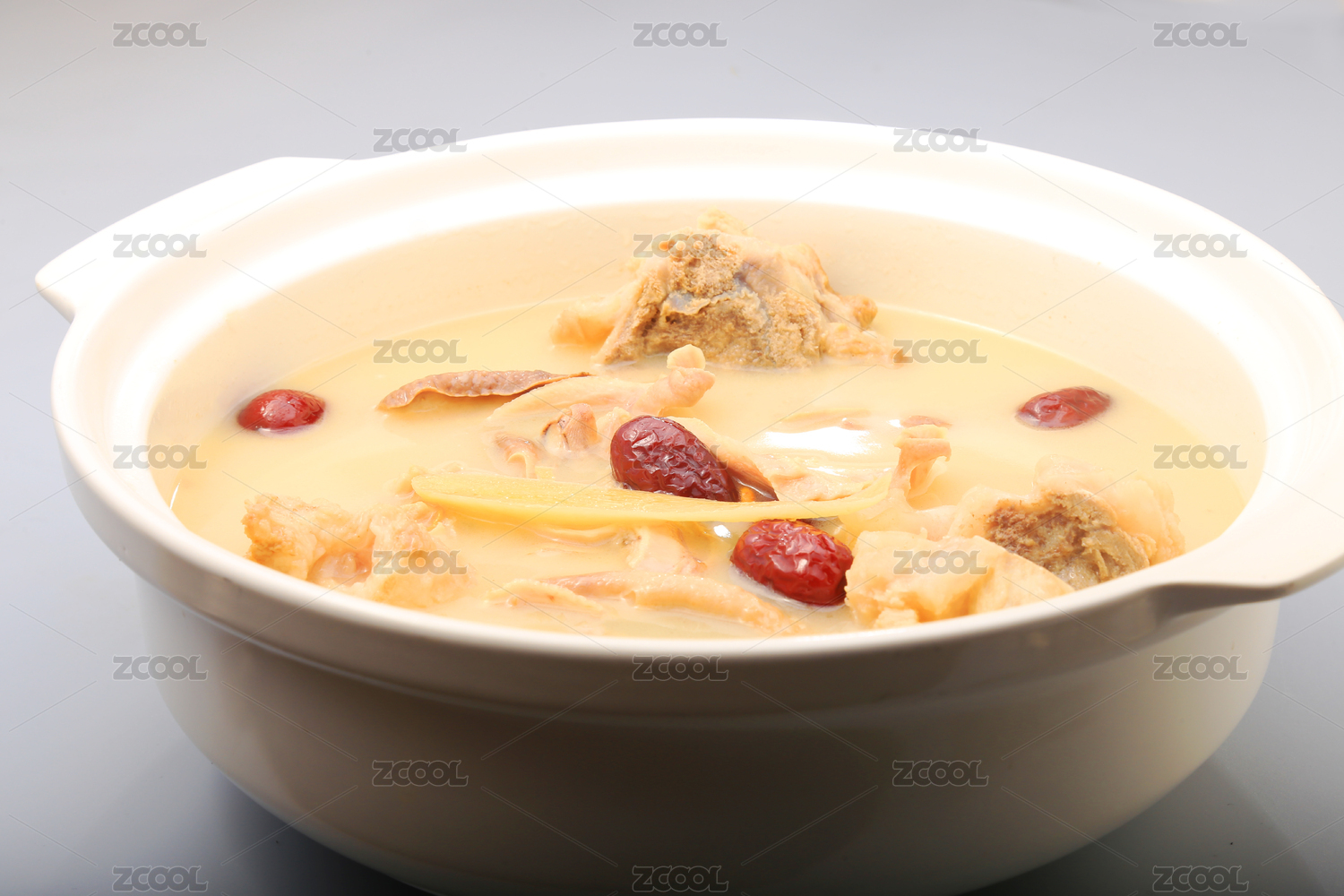 白色砂锅装的红枣虫草枸杞参鸡汤