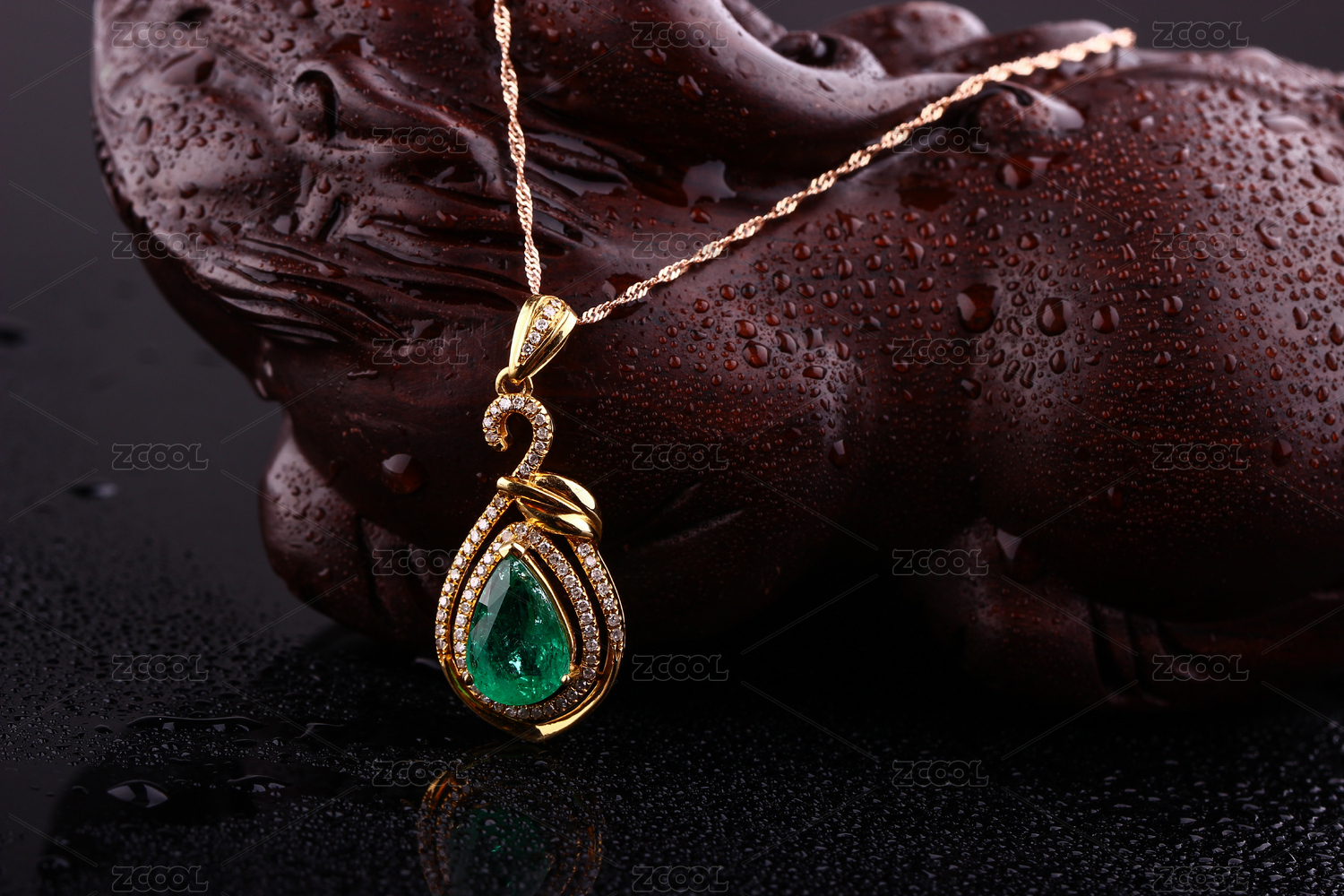 祖母绿宝石吊坠18K金晶亮的项链放在中式复古深色的背景里
