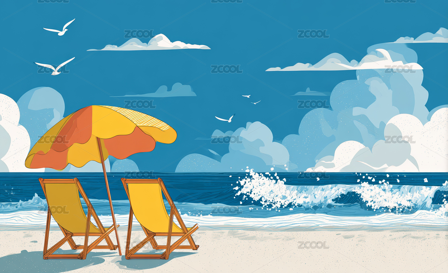 插画,AIGC202404,海边,沙滩,海浪,遮阳伞,沙滩椅