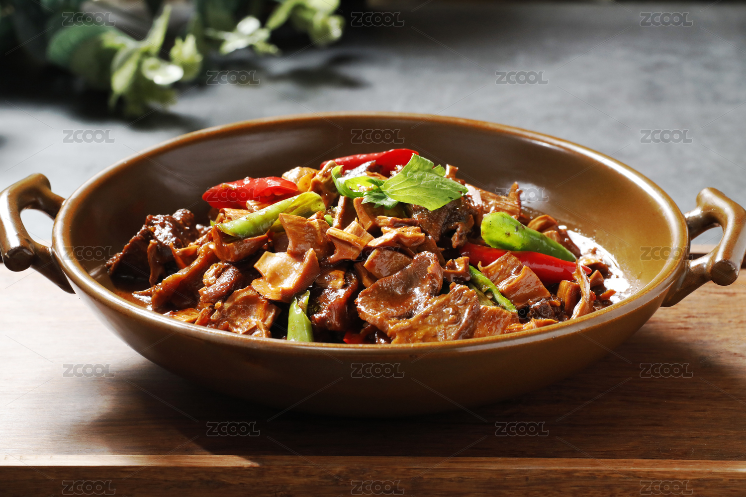 木托盘上褐色陶盘中的腊肉炒笋干