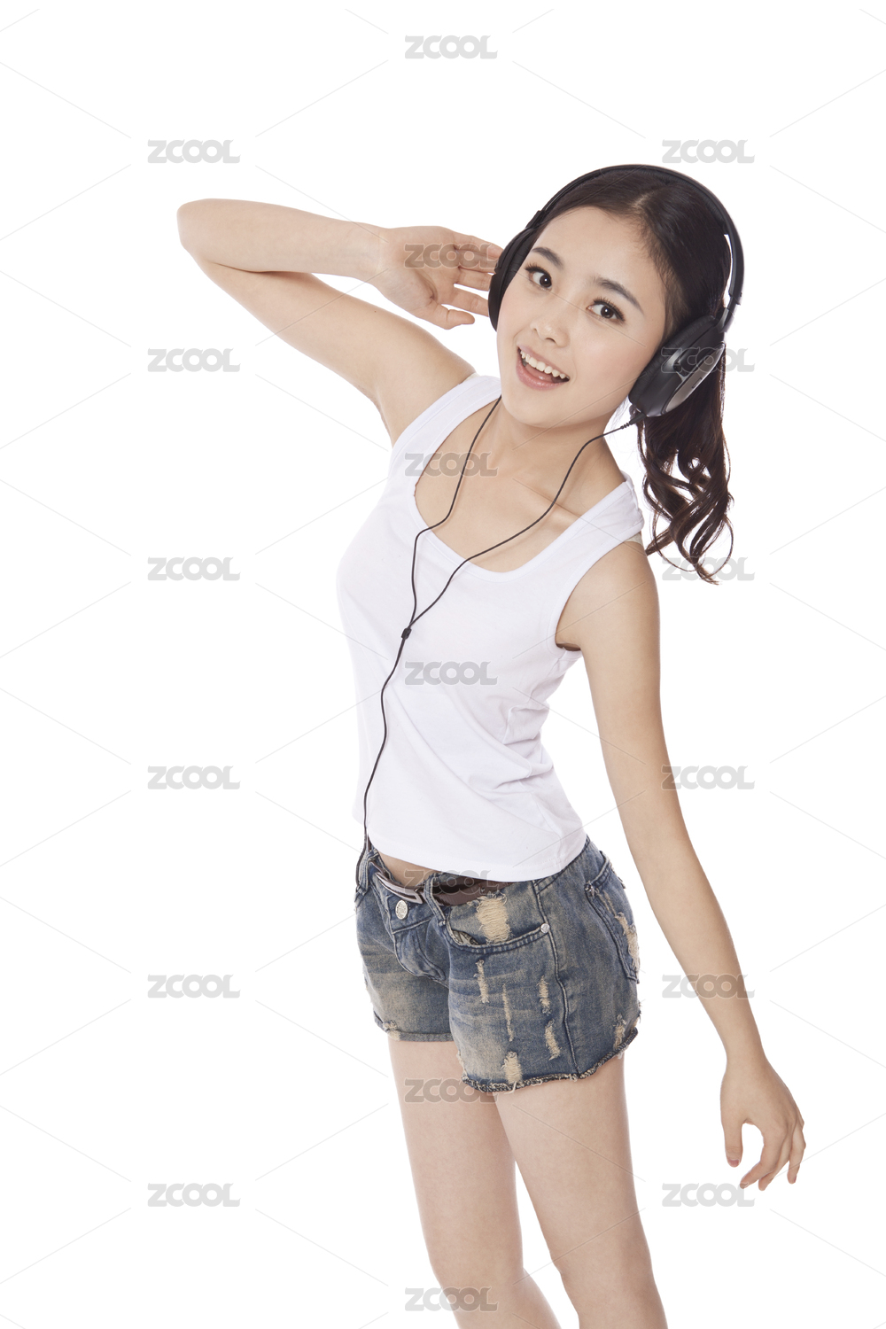 时尚年轻女子戴着耳机,听音乐