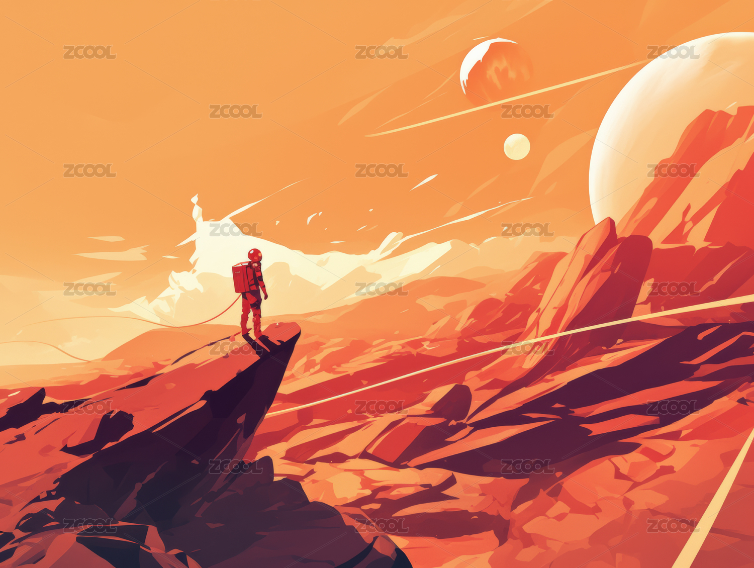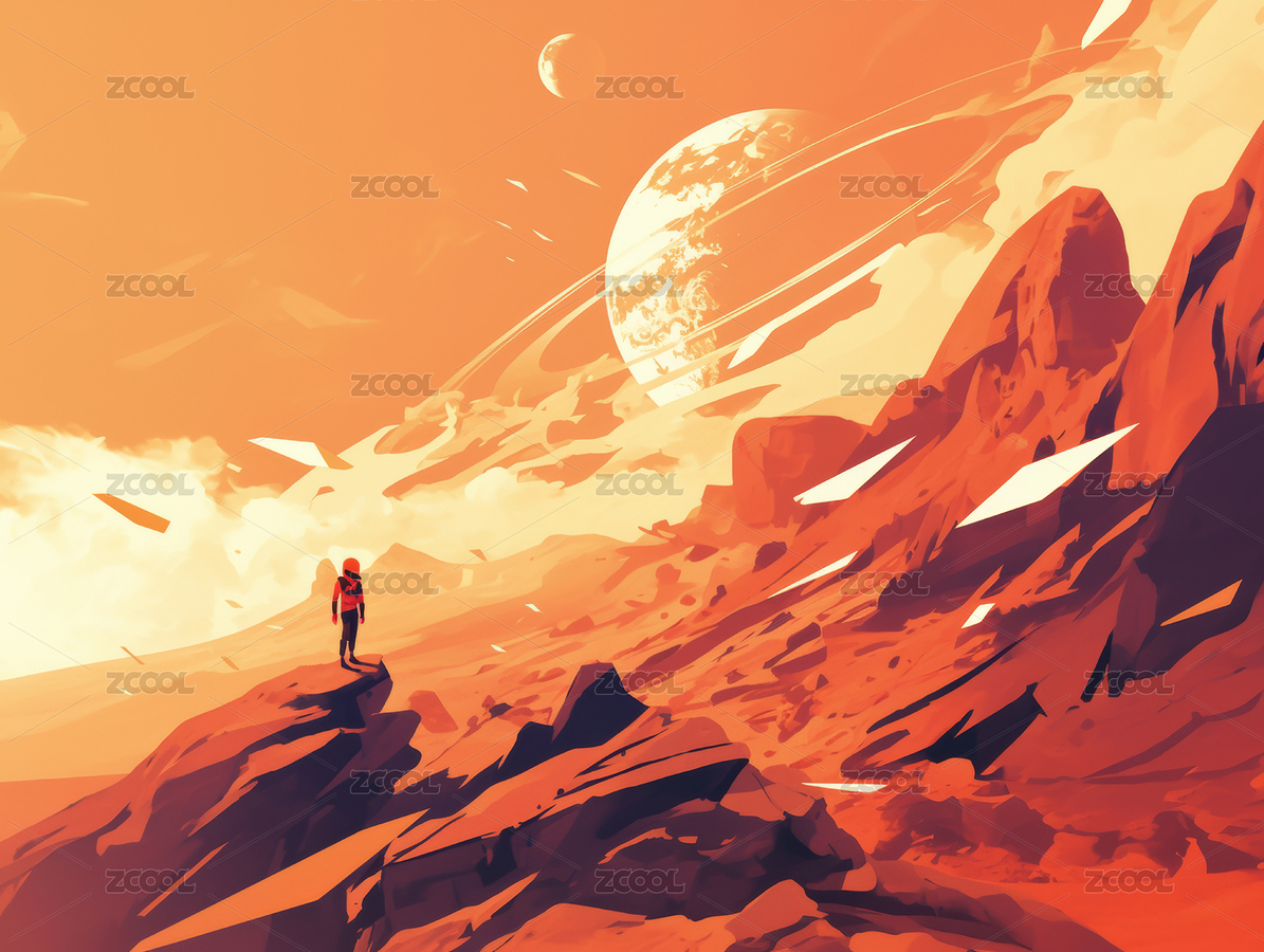 宇航员,太空,星球,红色,橙色,山,岩石,云,天空,孤独