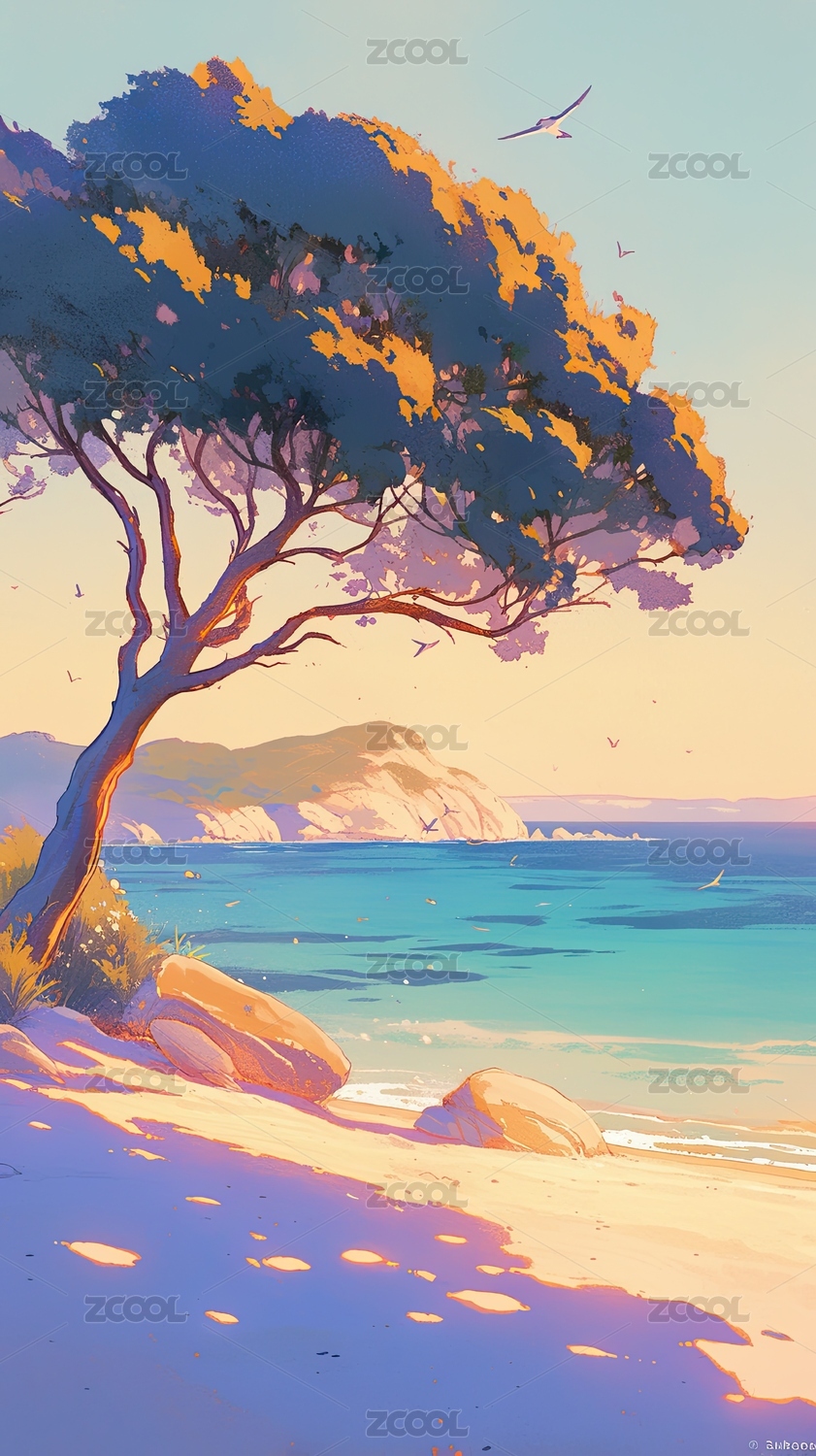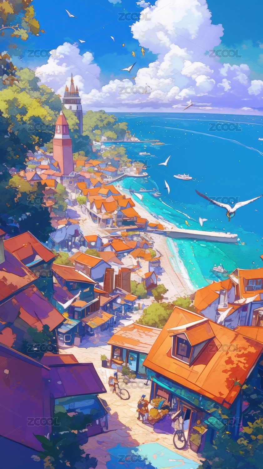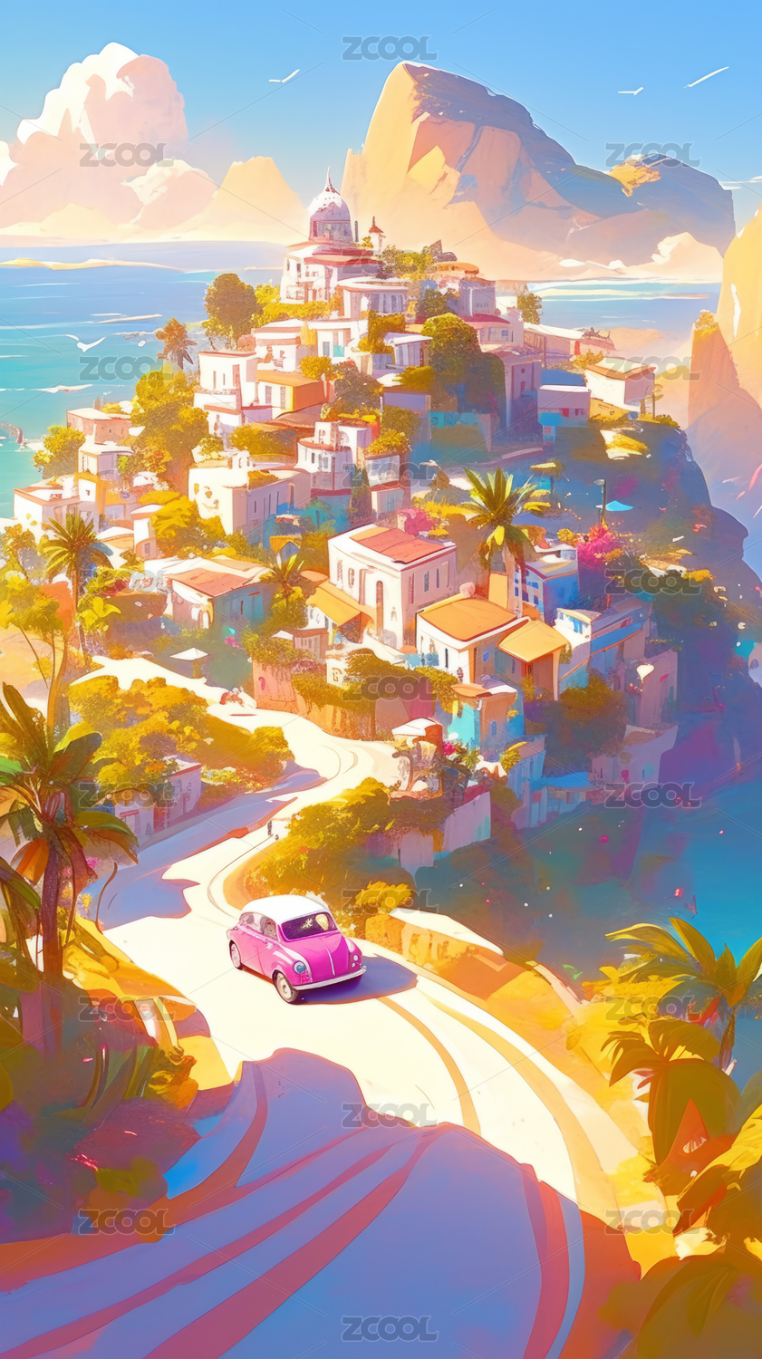 黄色,汽车,海滨,小镇,热带,椰子树,蓝天,白云,大海,风光