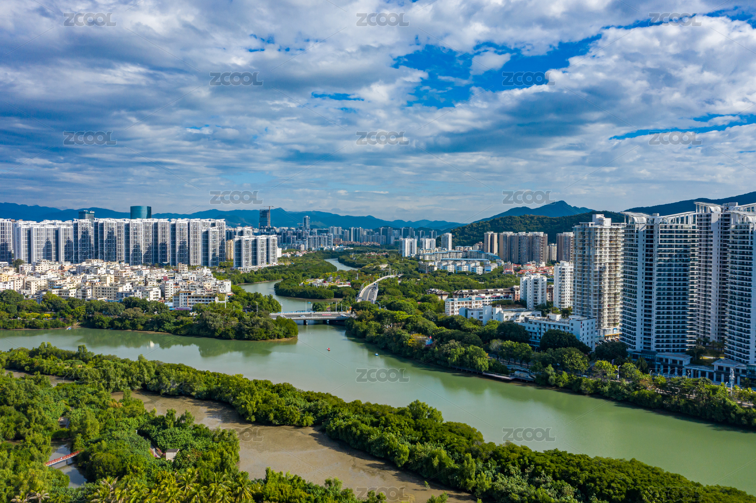 航拍中国海南三亚河畔红树林公园三亚城市乐园