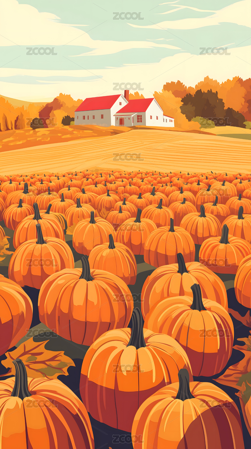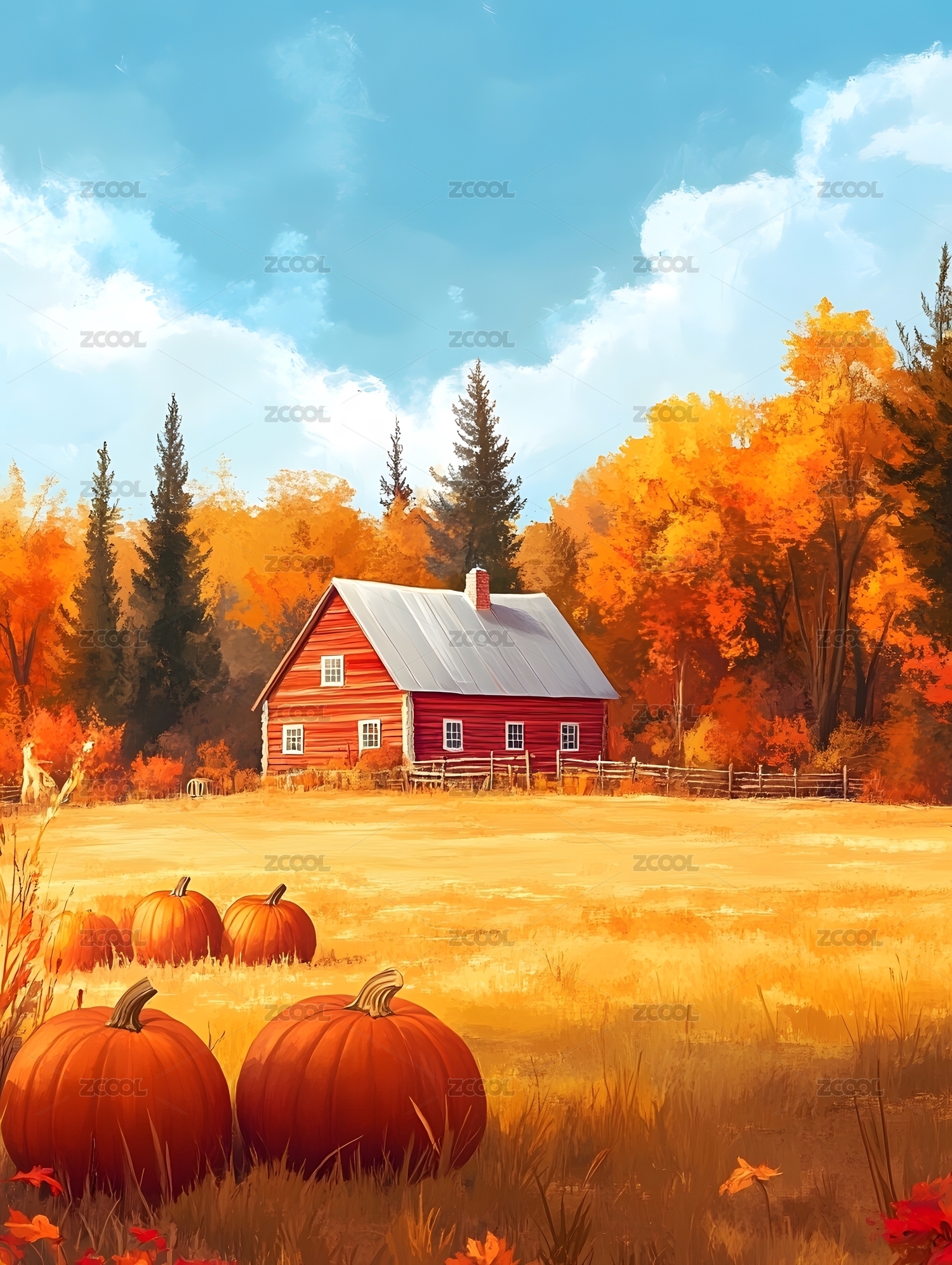 秋天丰收的金色水稻麦子与农庄蓝天白云插画