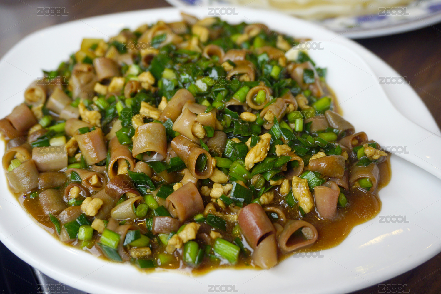 白色圆盘装的肉炒百合