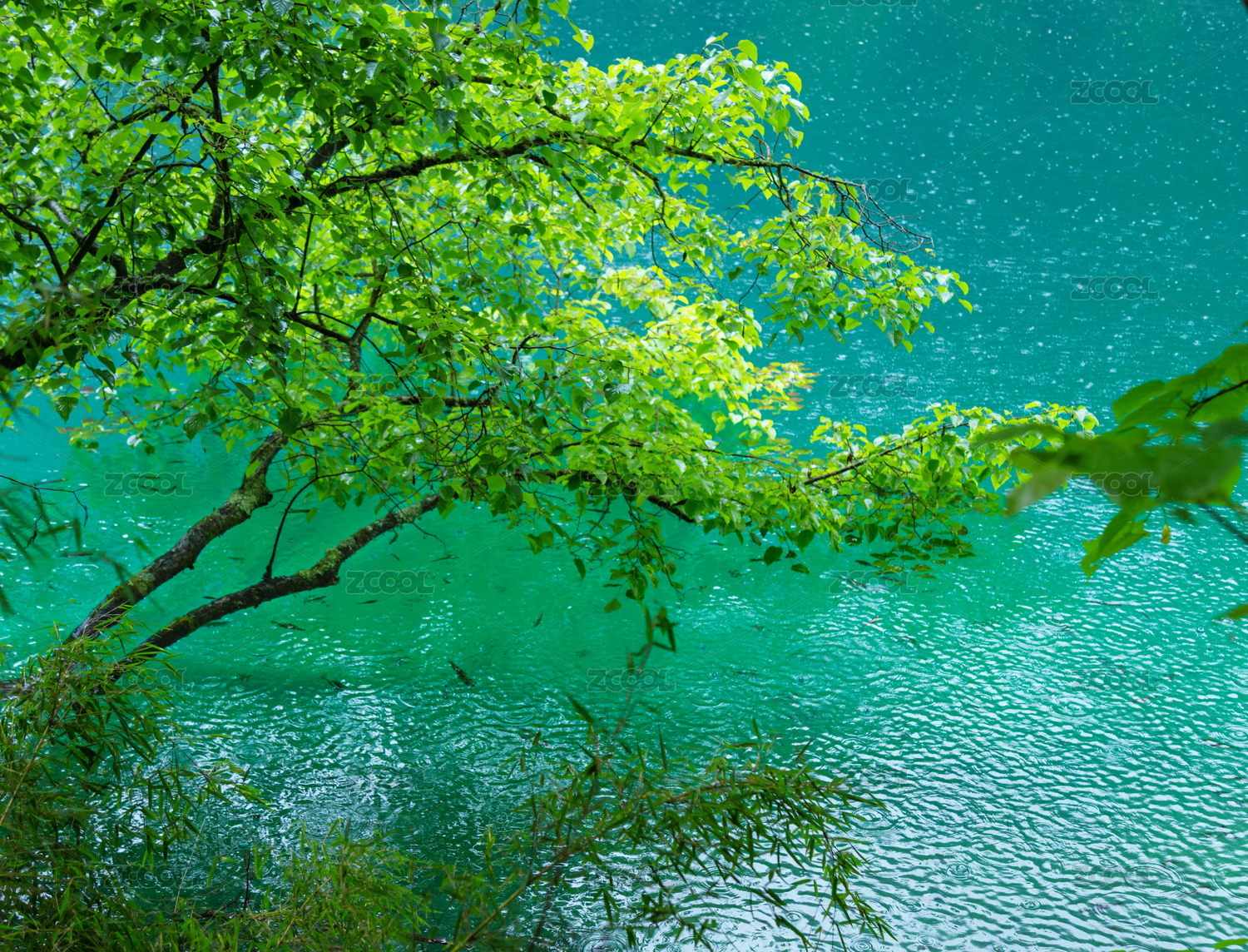 中国四川省阿坝州九寨沟风景区-湖边的绿色枝叶和湖水中的倒影
