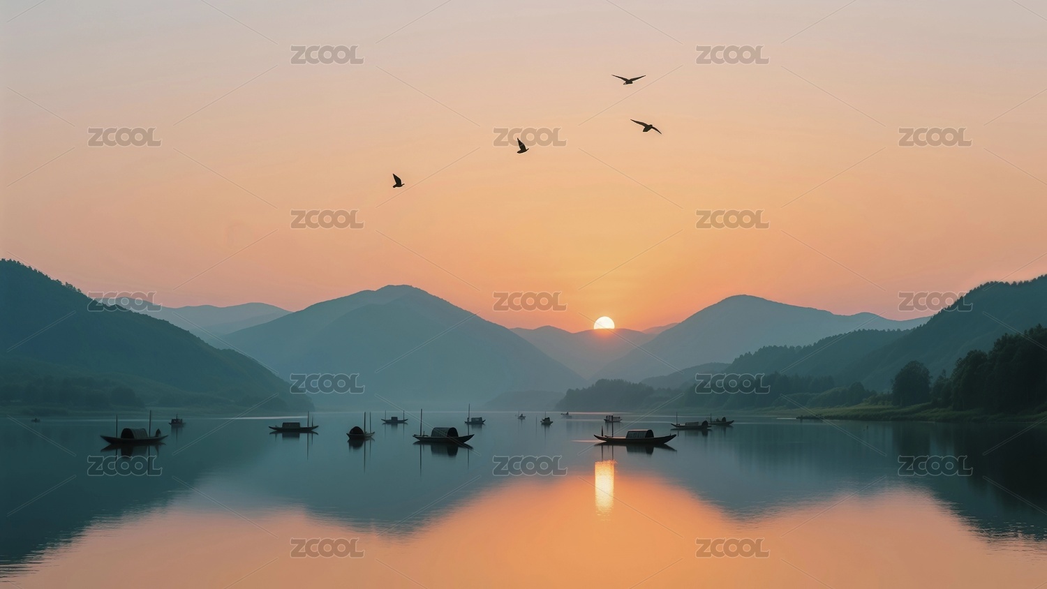 夕阳,天空,黄昏,日出,湖水,湖泊,船,小船,剪影,山