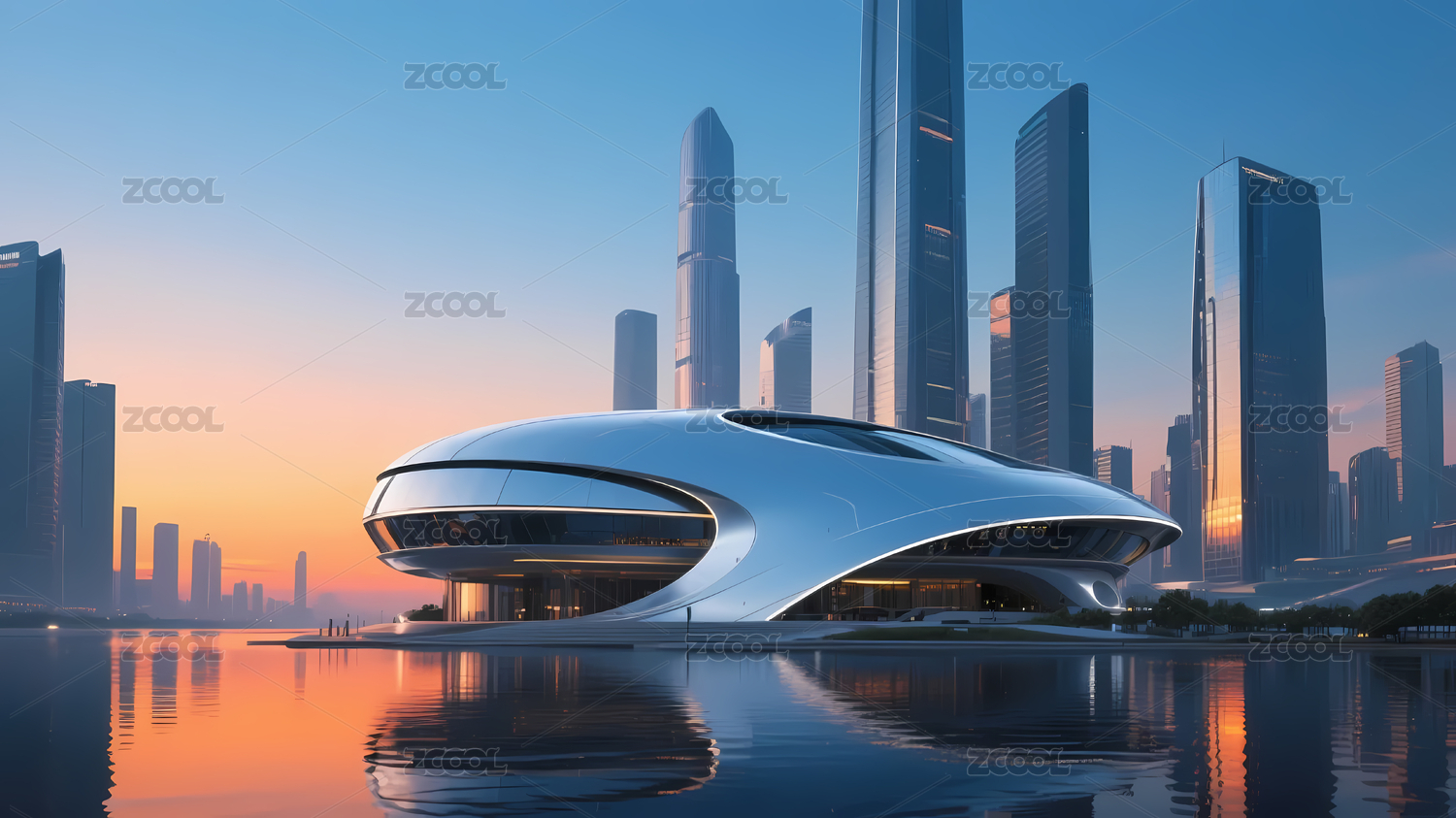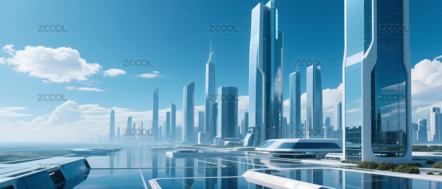 平静水面上的未来科技感城市建筑