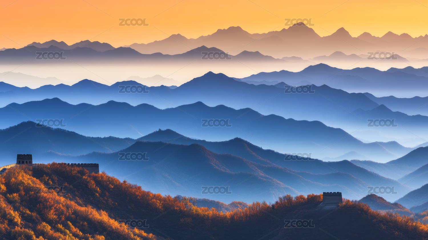 日落的长城,远处的雾和层层叠叠的山脉轮廓