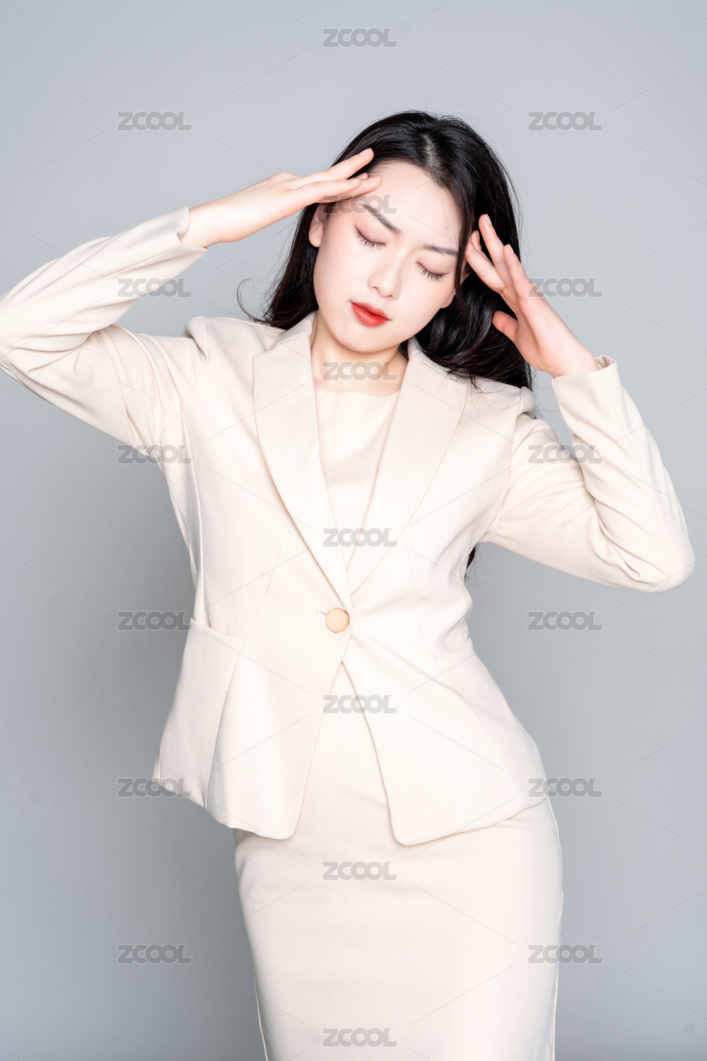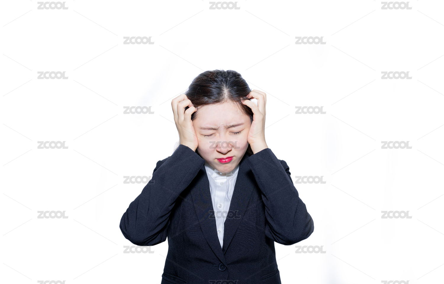 白色背景下一个中国女员工穿着正装西服抱着自己的头感到很烦恼头痛头疼压力大