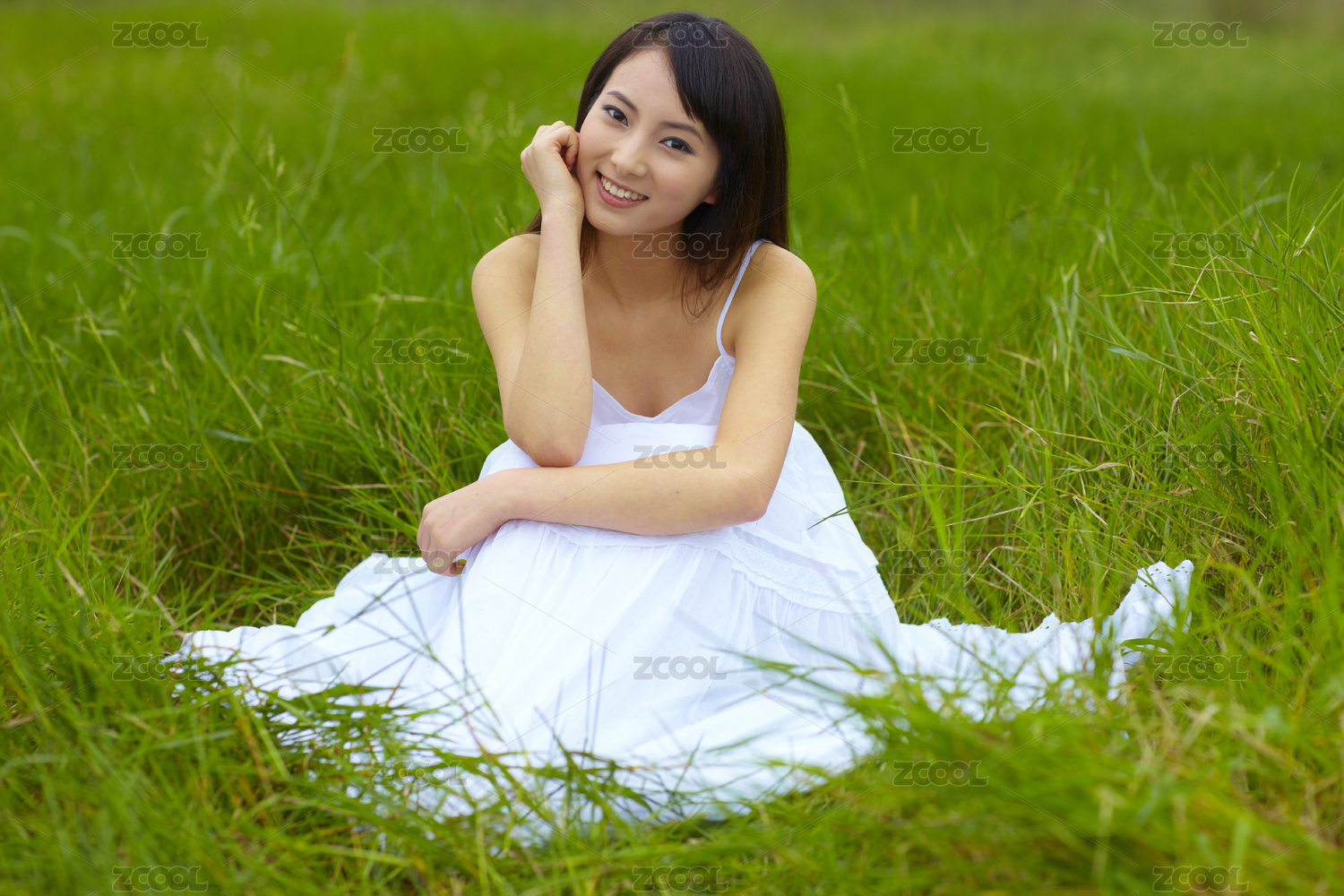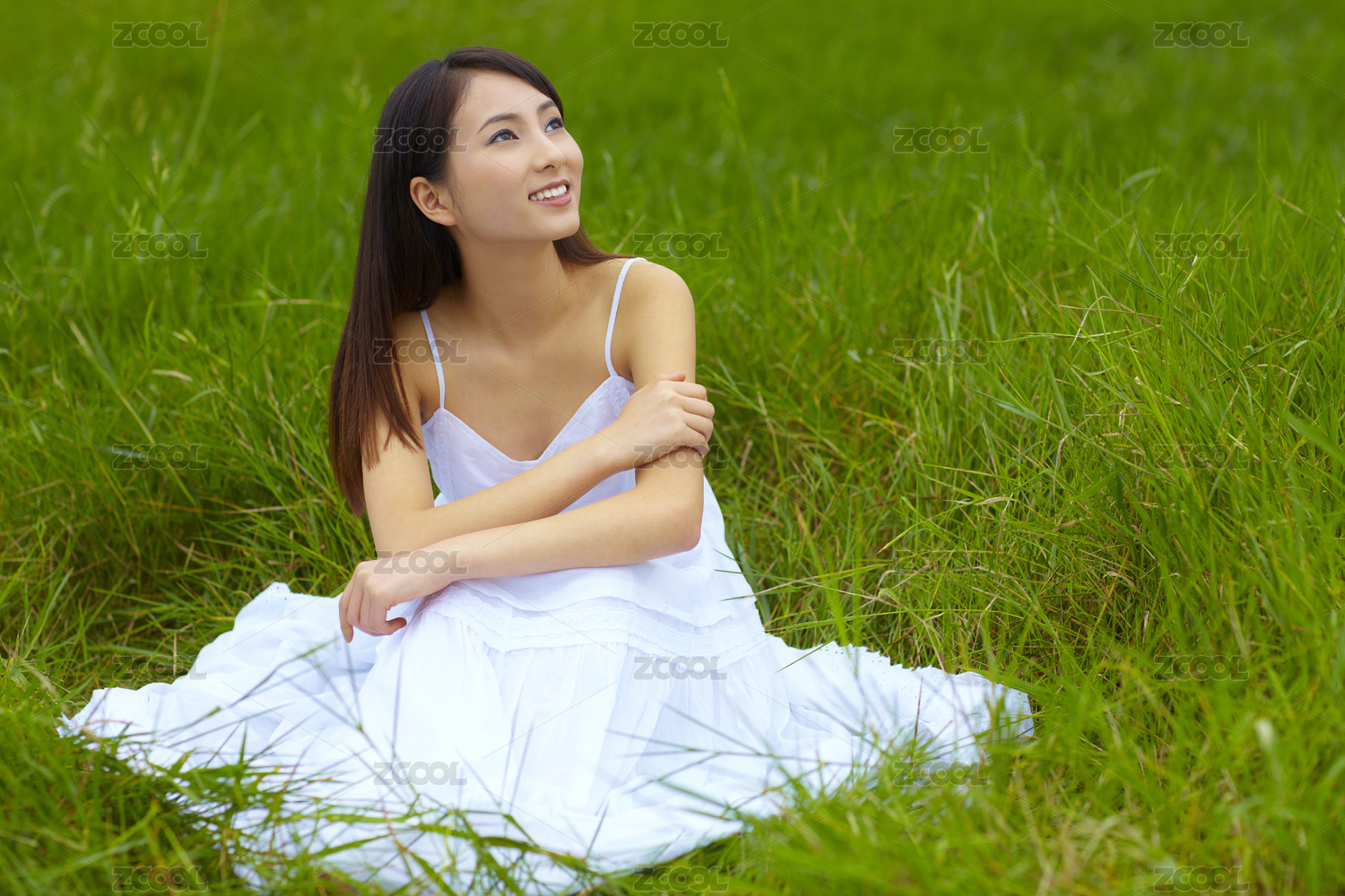 年轻漂亮的亚洲女人户外与白色礼服草甸