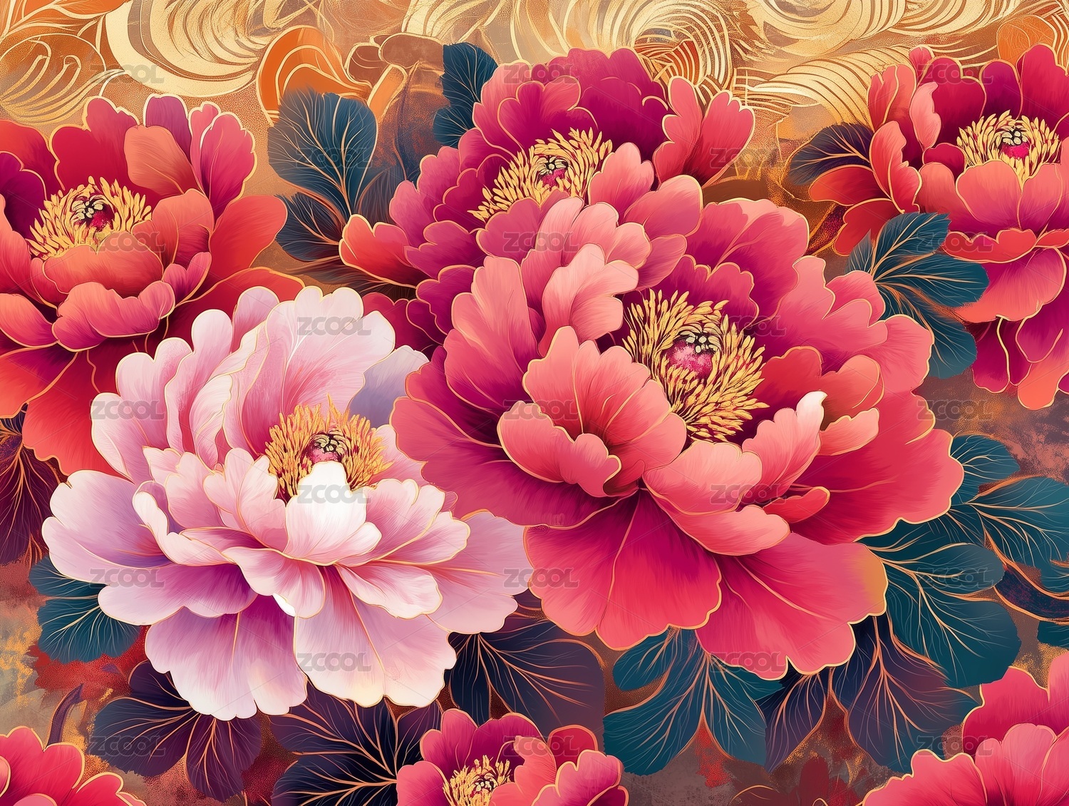 传统海边牡丹图案插画海报背景