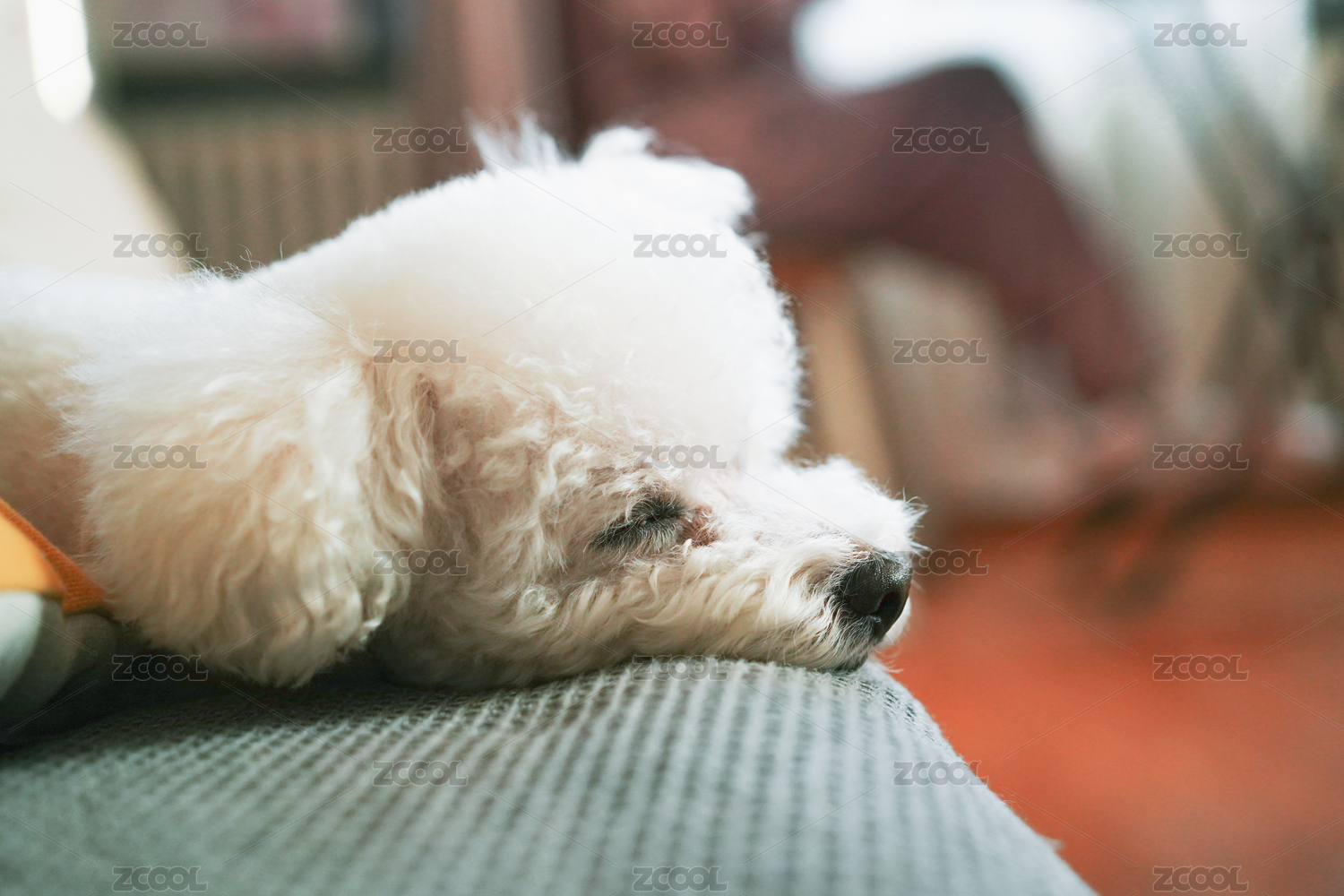 一只黑白毛发的宠物狗在室内沙发上趴着
