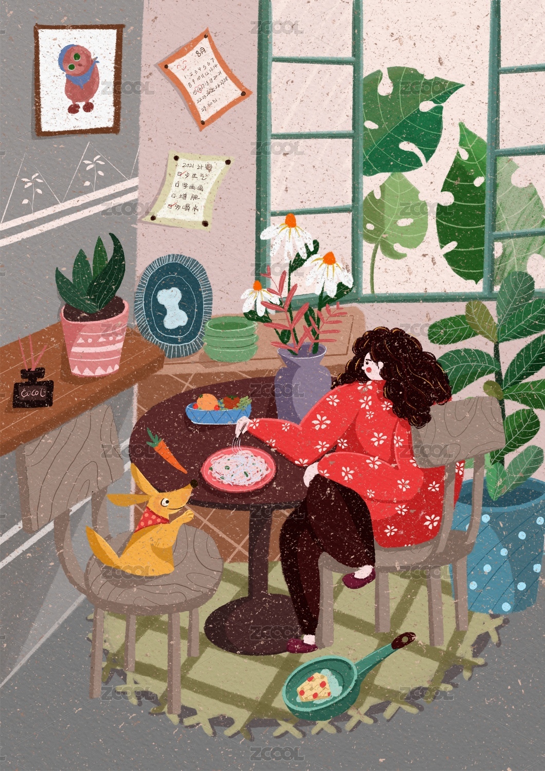 女孩在家享受美好早餐的一天-治愈插画