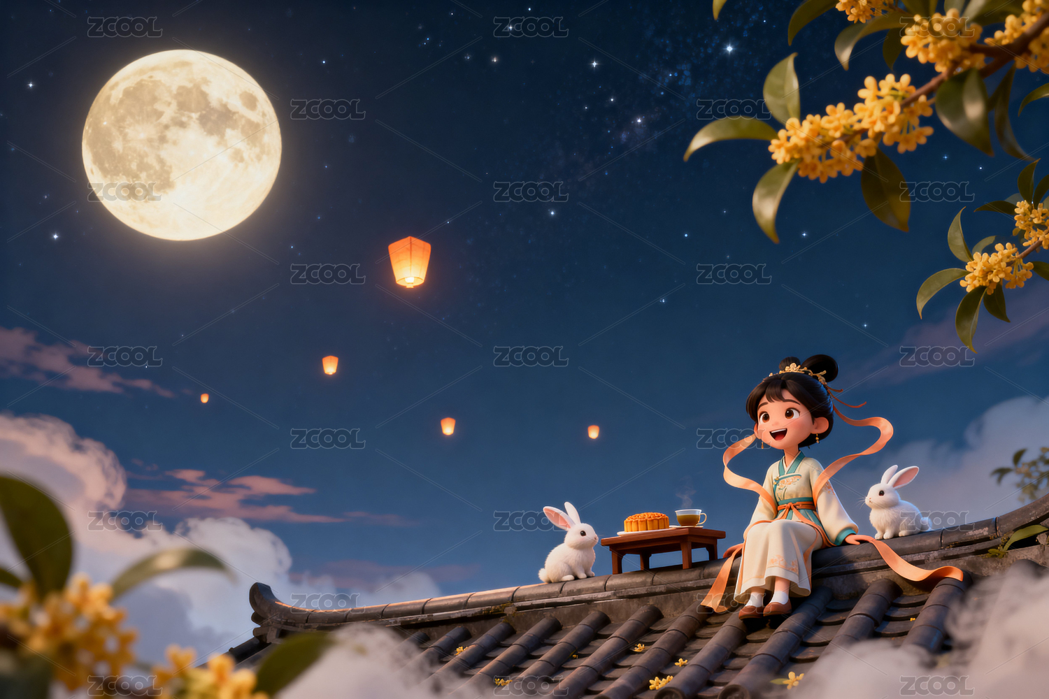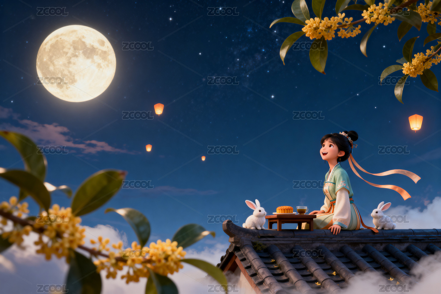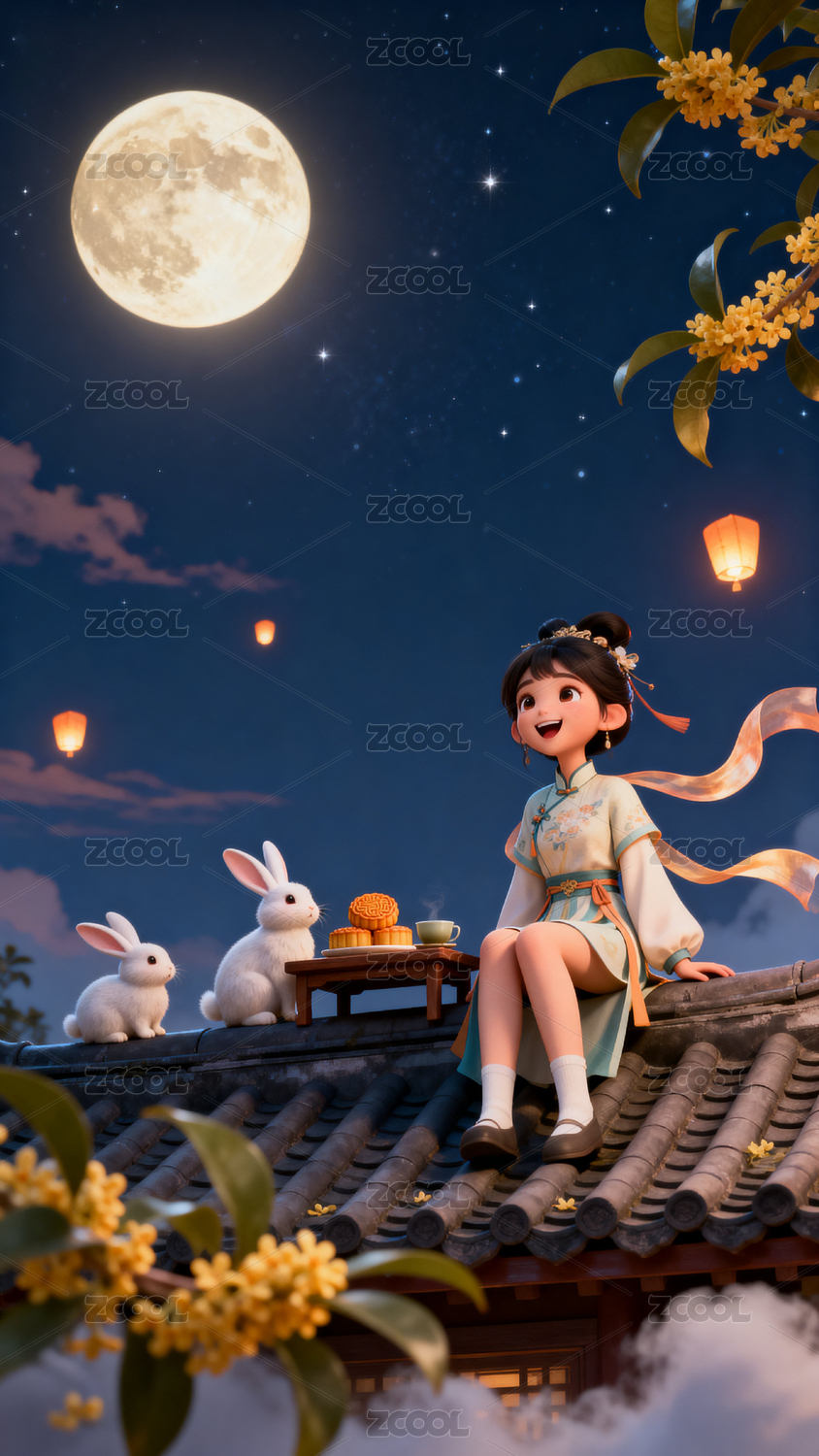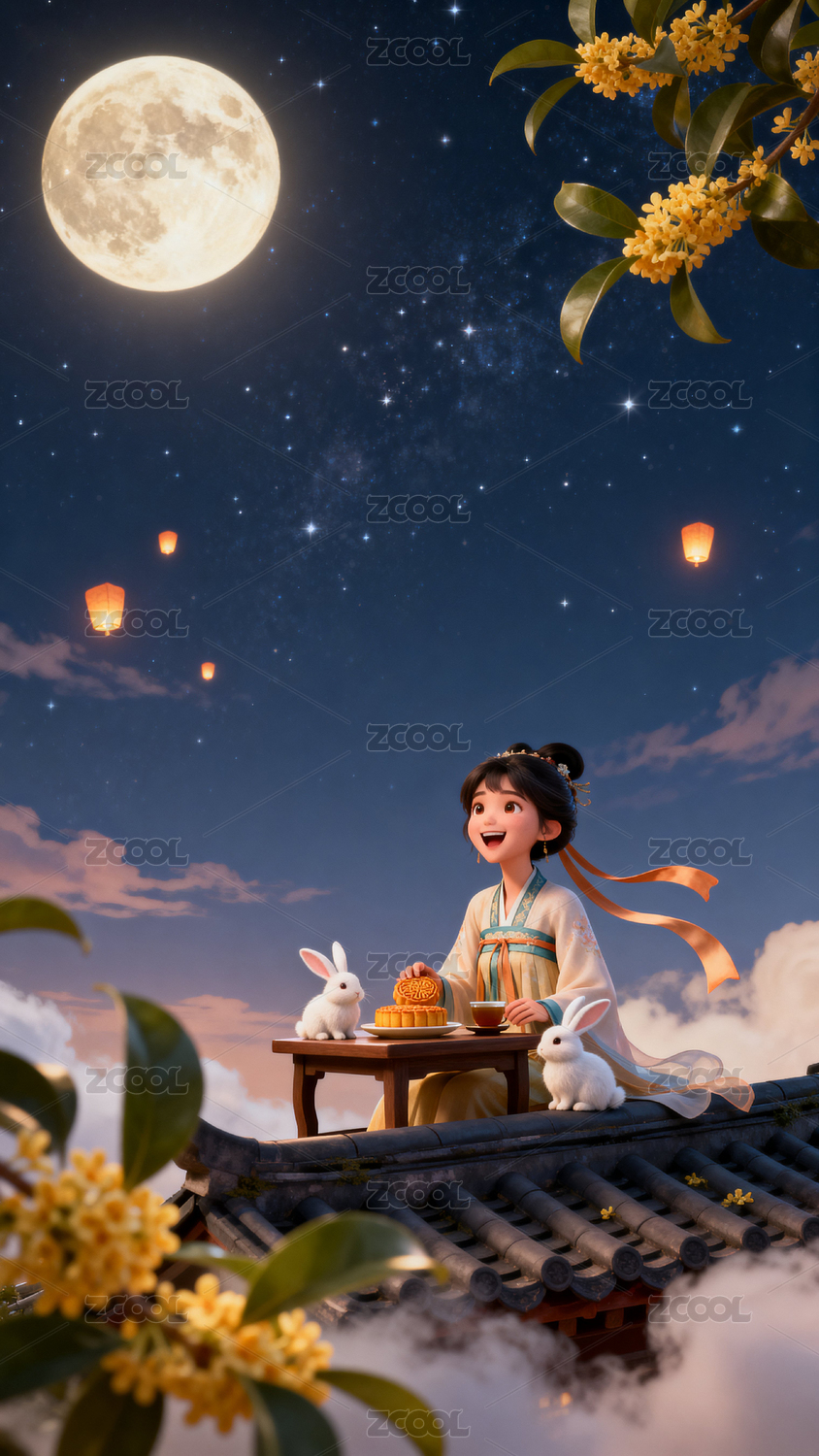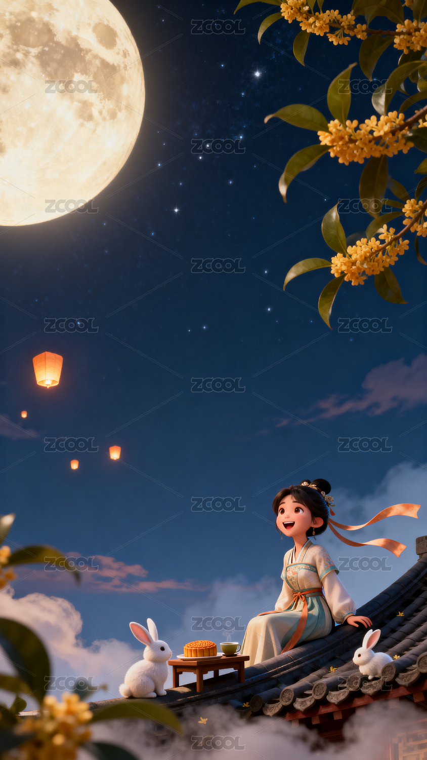嫦娥和玉兔坐在屋顶在桂花树下赏月