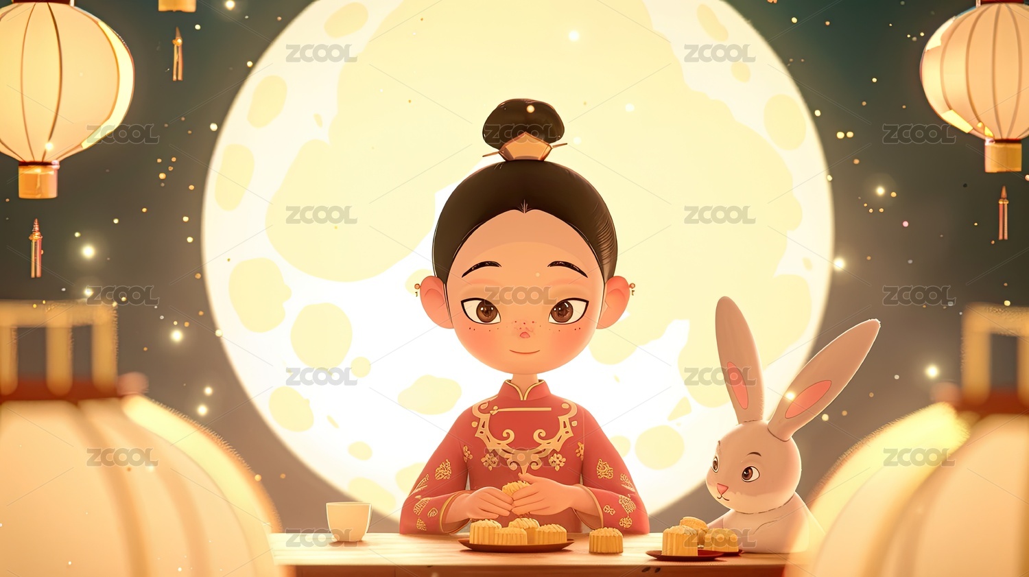 中秋佳节少女与玉兔共庆团圆