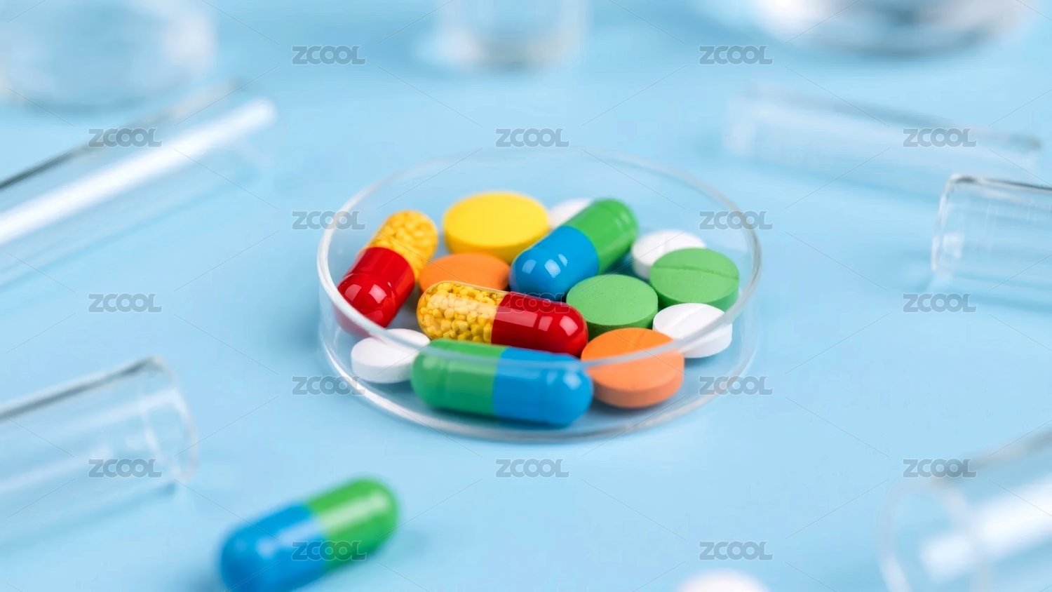 在蓝色背景上用于医疗治疗用中西药药丸胶囊
