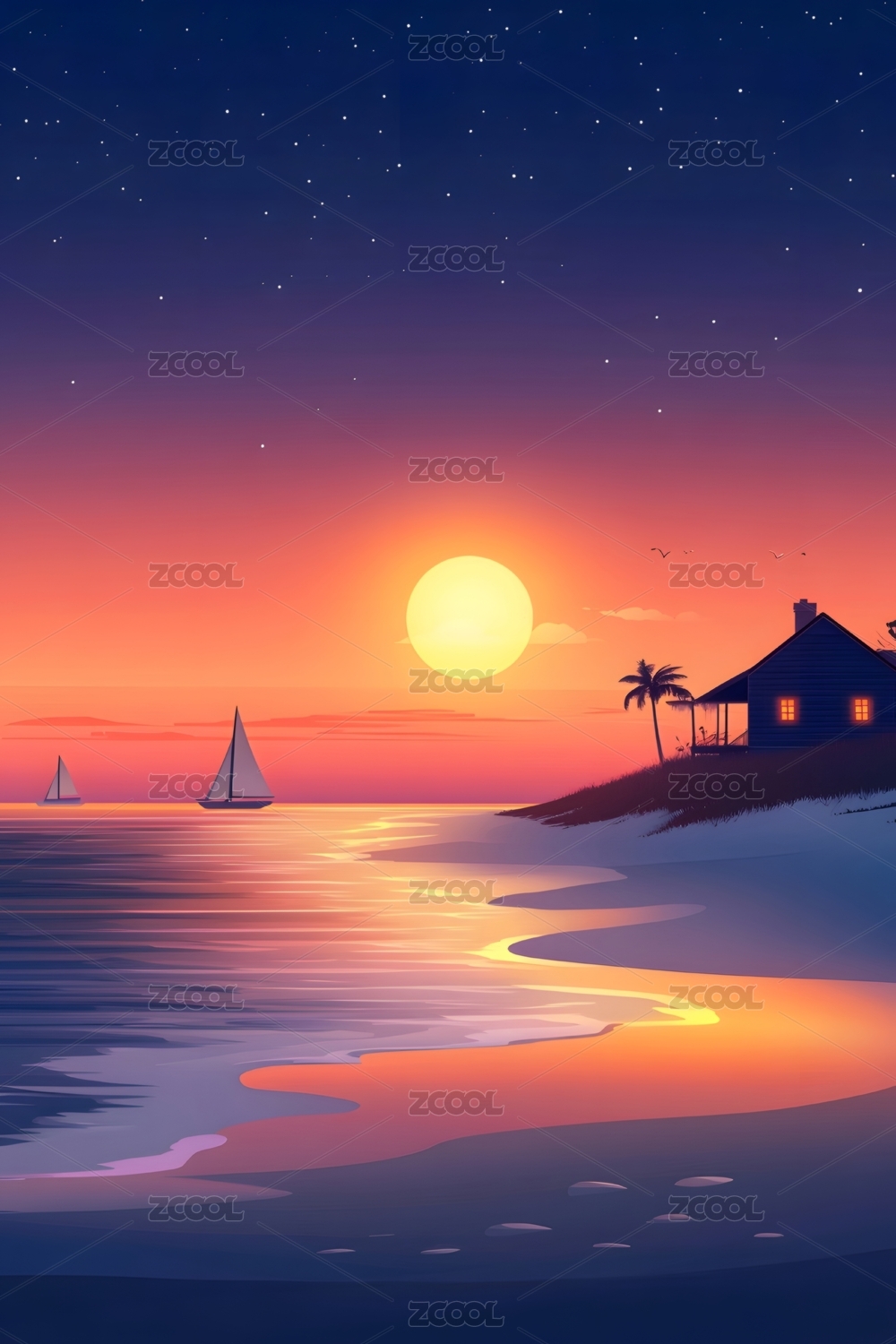 落日,海边,沙滩,公路,优美,矢量,紫色,黄色,插画,手绘