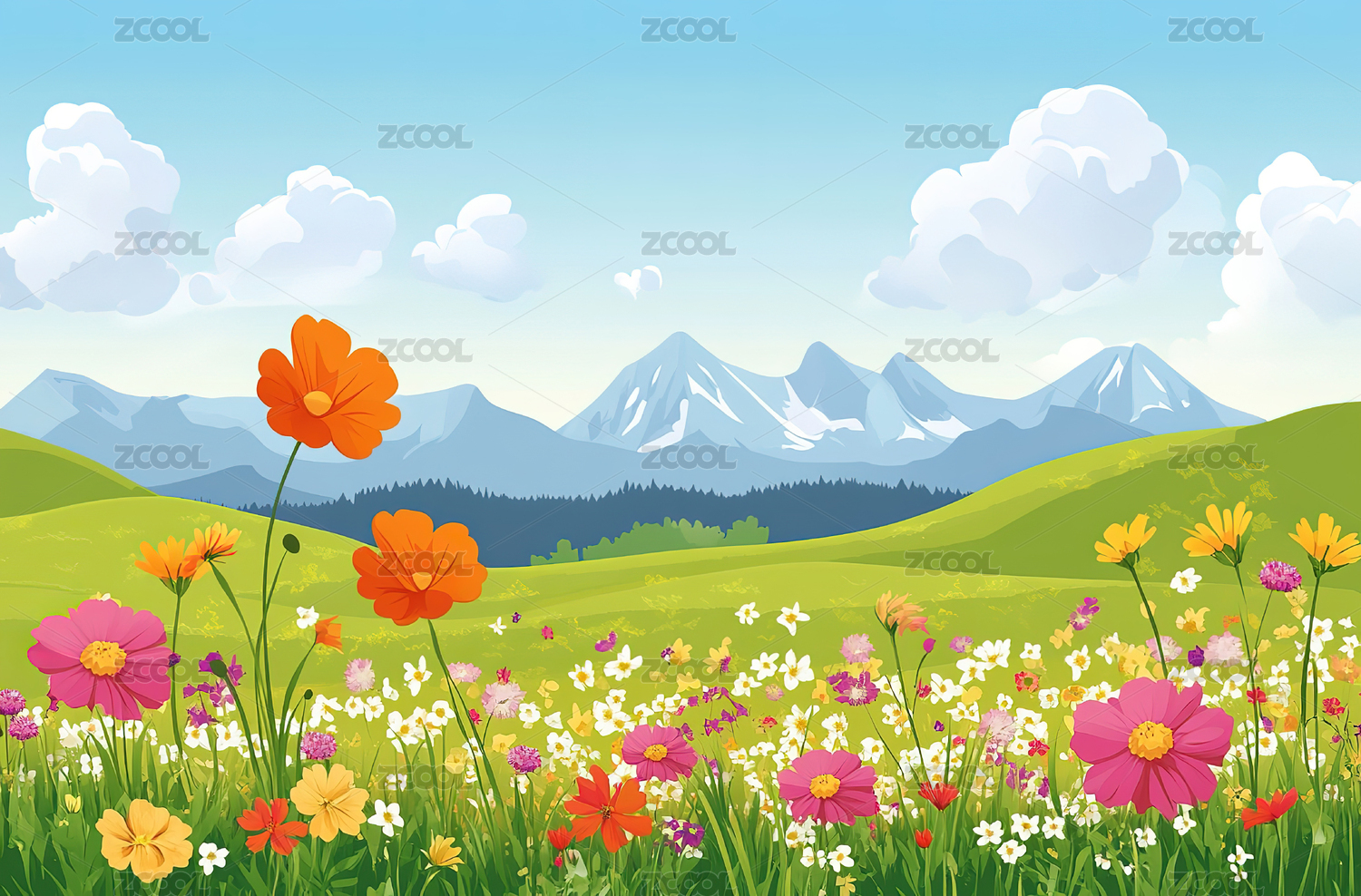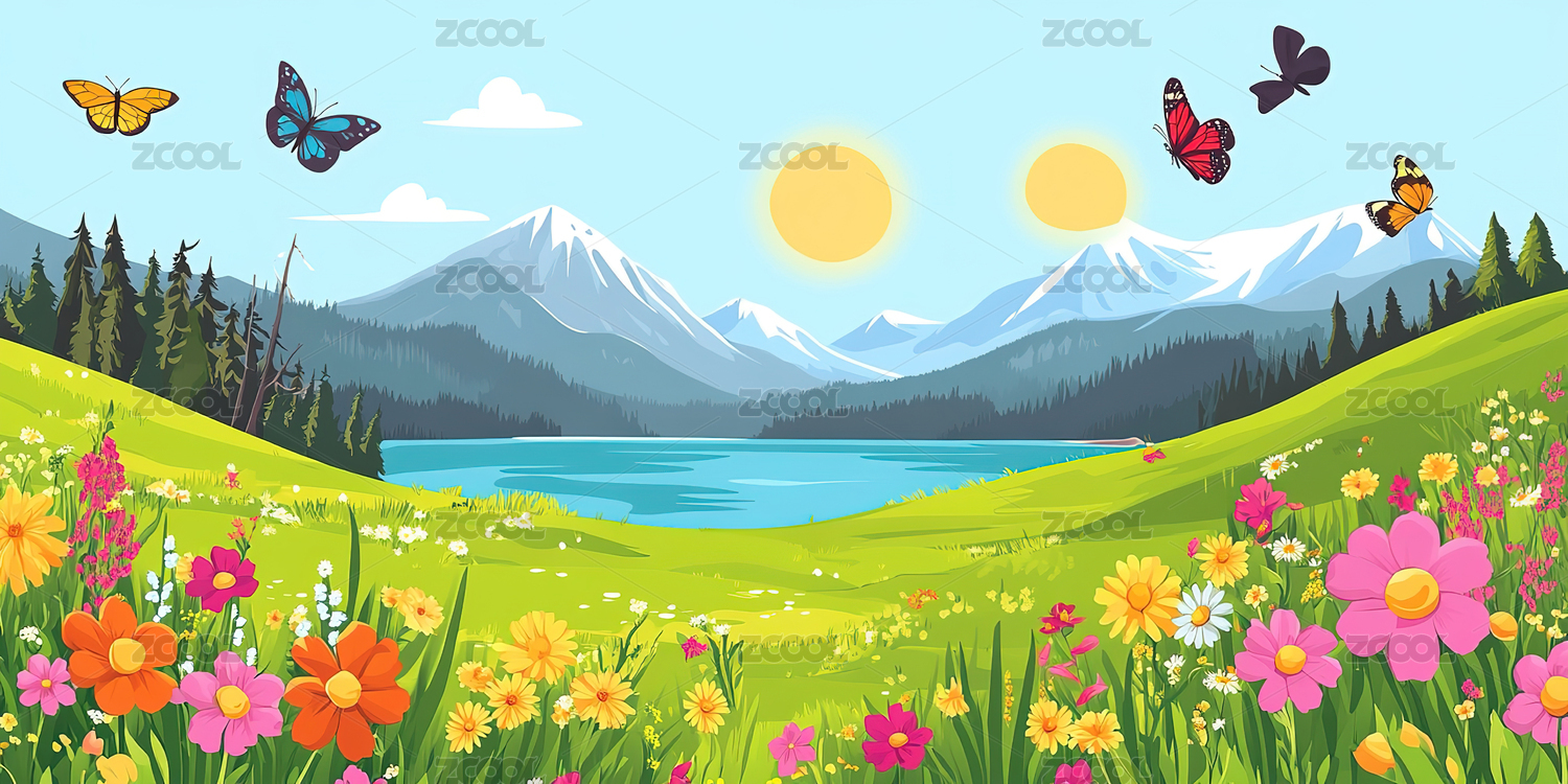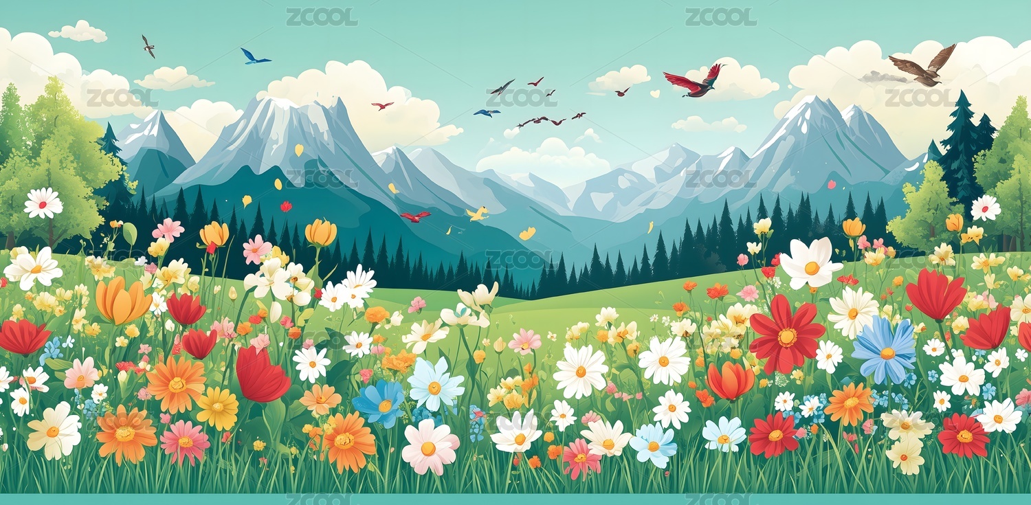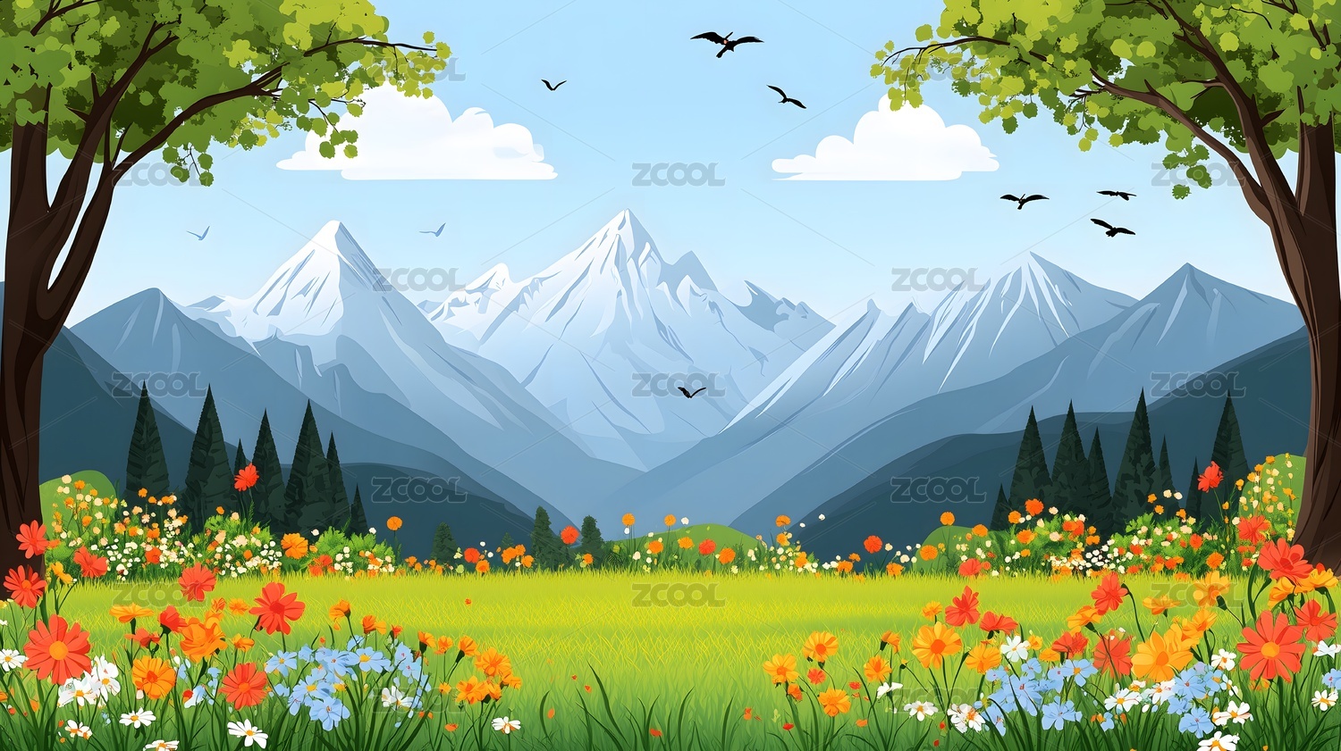 山峦叠嶂,鲜花盛开,鸟儿飞翔