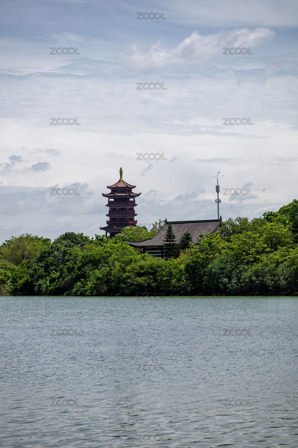 福建厦门杏林湾湖畔古塔与绿树环绕
